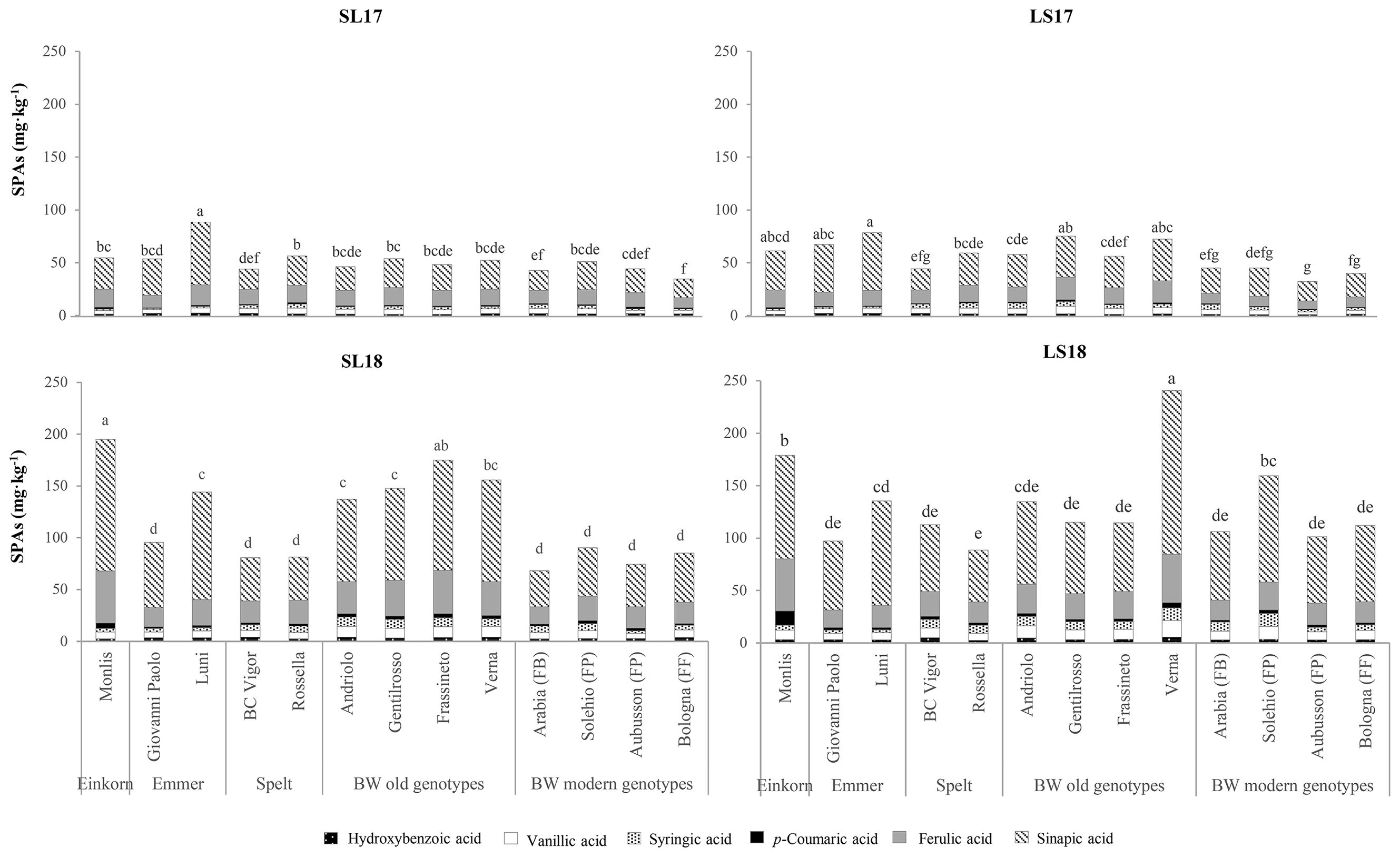 Bar charts labeled SL17, LS17, SL18, and LS18 show the concentration of soluble phenolic acids (SPAs) in various genotypes measured in milligrams per kilogram. Different acids are represented by distinct patterns: hydroxybenzoic, vanillic, syringic, p-coumaric, ferulic, and sinapic acids. The charts compare ancient grains (Einkorn, Emmer, Spelt) against both old and modern genotypes of bread wheat (BW), highlighting variations in SPA levels. Each bar is annotated with letters indicating statistical differences.