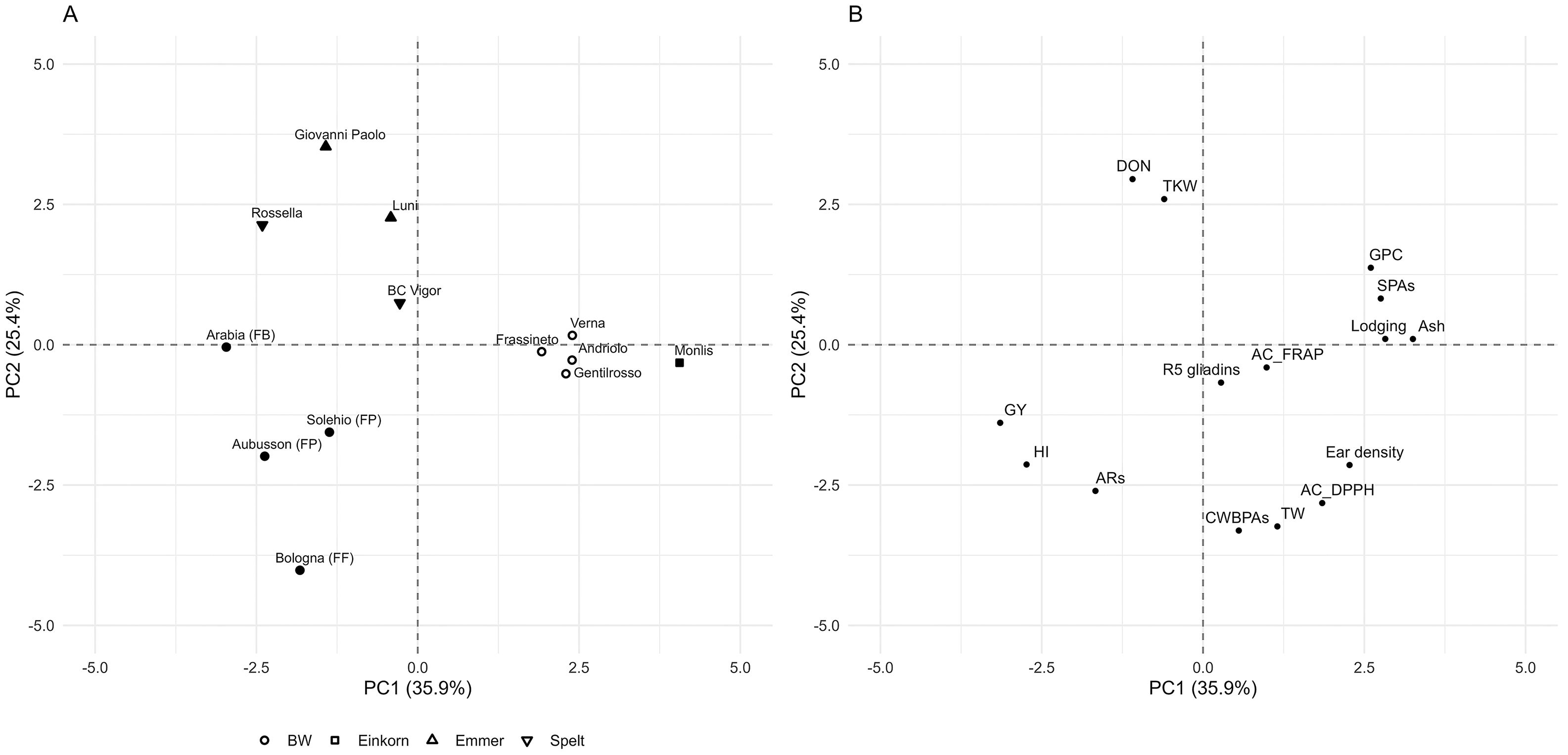 Two scatter plots labeled A and B compare wheat varieties and related metrics. Chart A shows data points representing varieties like Giovanni Paolo, Rossella, and Bologna along PC1 (35.9%) and PC2 (25.4%) axes. Chart B displays metrics such as DON, TKW, and GPC on the same axes. Different shapes represent wheat types: circle, square, triangle, and inverted triangle.
