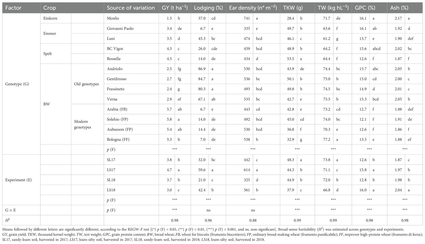 Table 1. Effect of the genotype, the experiment, and their interaction on the agronomic traits and qualitative parameters of the investigated genotypes cultivated in the experimental trials and supplied with 80 kg N ha−1.