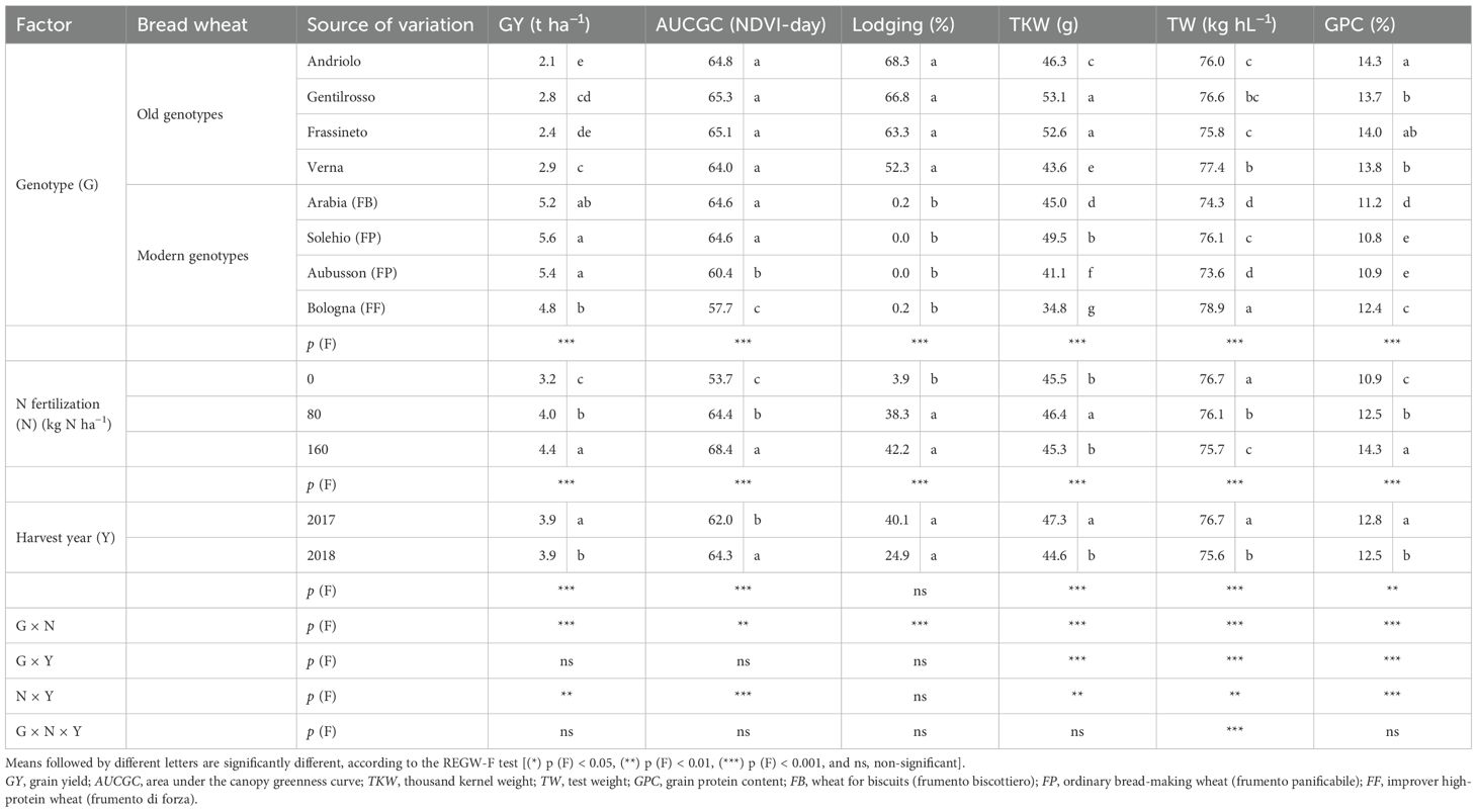 The effect of N fertilization on the agronomic and rheological parameters was examined using ANOVA, considering only the old and modern BW genotypes cultivated in the sandy-loam soil at Cigliano over the 2 years. The treatments were factorial combinations of eight genotypes (G), three N fertilization rates (N), and two harvest years (Y), which were considered as fixed effects. Means were identified as significantly different on the basis of the REGW-F statistical test.