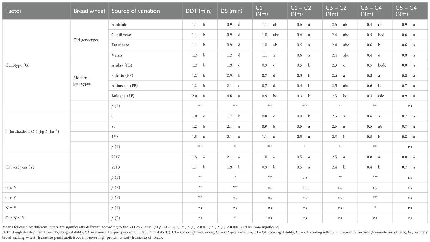 Table 3. Effect of the genotype, the N fertilization rate, the harvest year, and their interaction on the rheological parameters of the refined flour of the investigated bread wheat genotypes cultivated in the Cigliano experimental area.