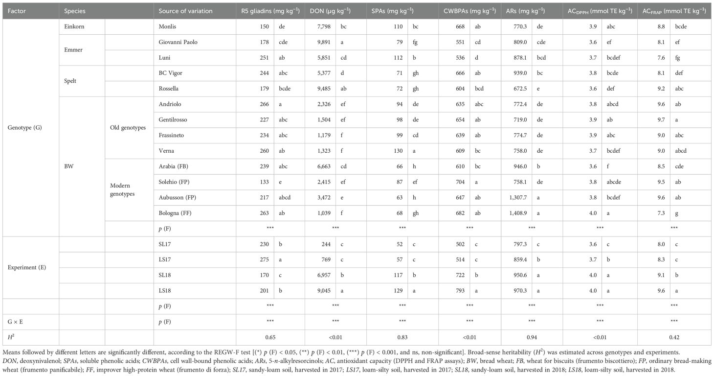 Table 4. Effect of the genotype, the experiment, and their interaction on the R5 gliadin content of the refined flour and on the DON content, the bioactive compounds, and the antioxidant capacity of the wholemeal flour of the investigated genotypes cultivated in the experimental trials and supplied with 80 kg N ha−1.