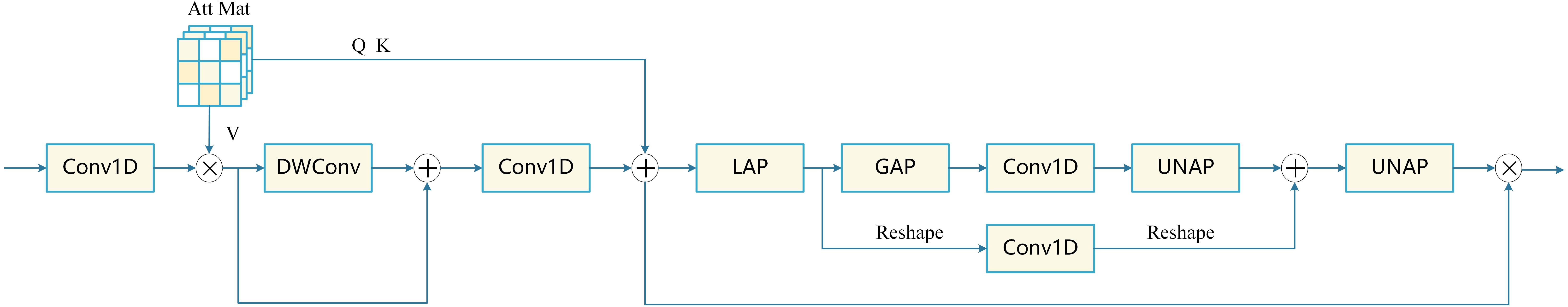 Where determines the spatial range of local feature extraction, with a default value of 5. C denotes the channel count within the feature map. This applies adaptive average pooling to reduce spatial dimensions to , while further compresses to a single value per channel. This two-branch strategy enables the module to concurrently process both local structural details and global contextual information.