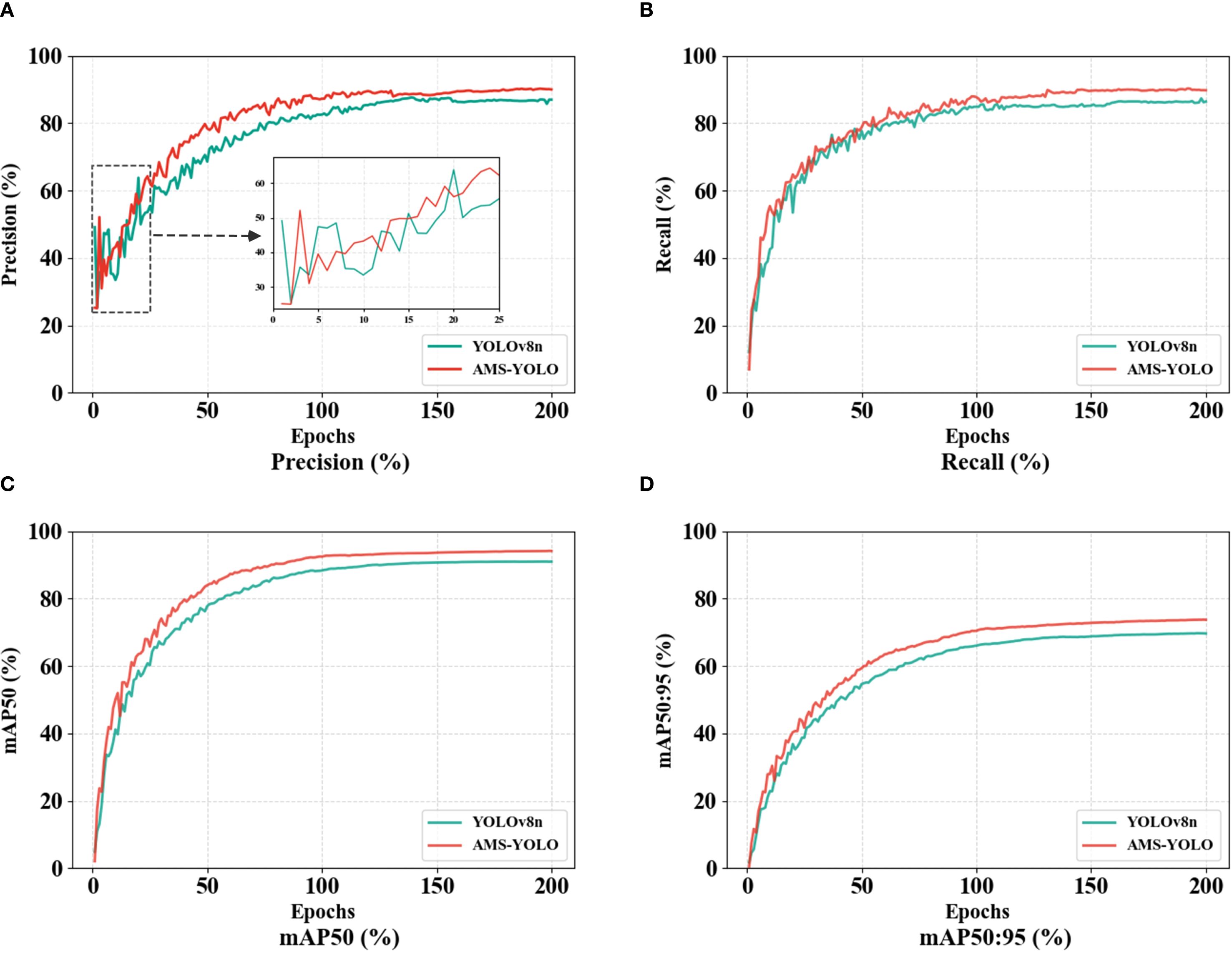 AMS-YOLO demonstrates superior performance across all detection metrics while maintaining lightweight design. Compared with lightweight YOLO variants like YOLOv5n and YOLOv12n, AMS-YOLO achieves advanced metrics with comparable parameter counts, indicating optimal balance between performance and computational efficiency. Compared with traditional architectures like SSD and RetinaNet, AMS-YOLO reduces computational overhead while improving detection performance by 15%. Transformer-based RT-DETR exhibits strong performance but requires 42.8M parameters. In contrast, AMS-YOLO achieves superior detection results with only 2.53M parameters, highlighting the proposed method’s efficiency.