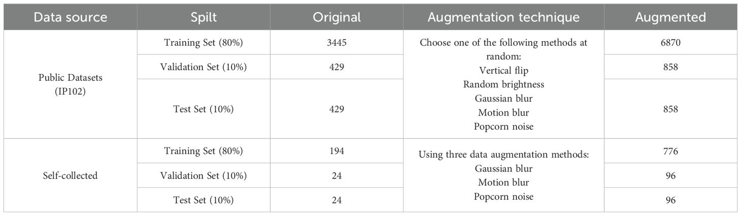 For the public dataset, we randomly applied one of five augmentation techniques: vertical flip, random brightness adjustment, Gaussian blur, motion blur, and Popcorn noise to increase data diversity. For self-collected field images, we applied three techniques: Gaussian blur, motion blur, and Popcorn noise. These methods simulate common imaging issues in agricultural environments, including camera shake, focus inaccuracy, and sensor noise. Table 1 shows the dataset composition before and after augmentation by source.