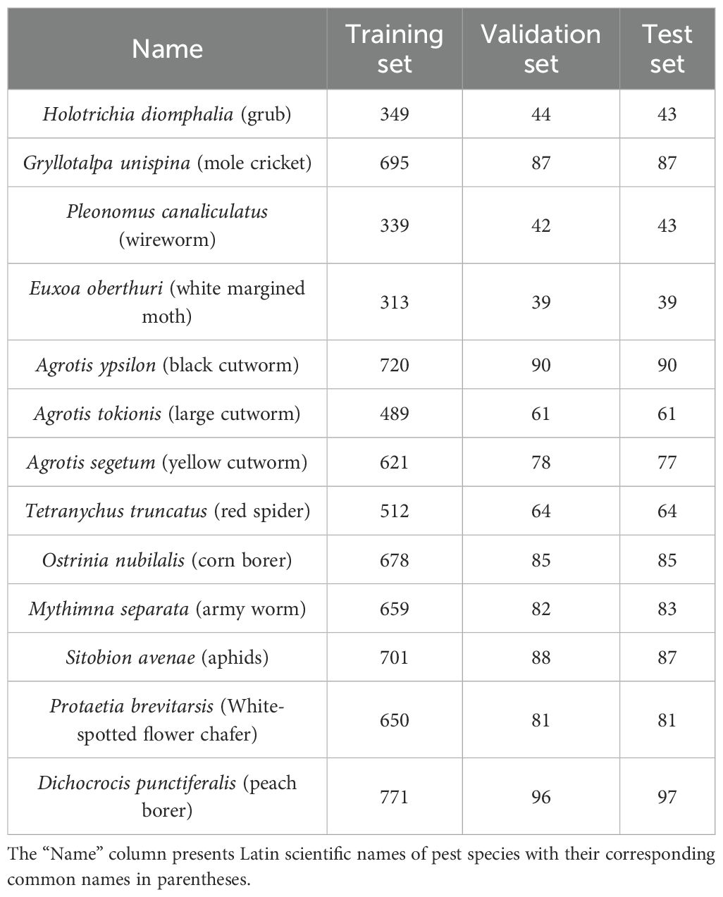 This study employed a maize pest identification dataset derived from the IP102 dataset (Wu et al., 2019), containing 13 maize pest species. After quality screening, we retained 4,293 valid images from the original dataset. We also captured 242 images using a Vivo S9 smartphone from a 2,500 m² experimental maize field at Jilin Agricultural University (43°79’N, 125°40’E) in July 2024. All images were annotated with rectangular bounding boxes under expert guidance. The dataset was randomly split into training, validation, and test sets in an 8:1:1 ratio.