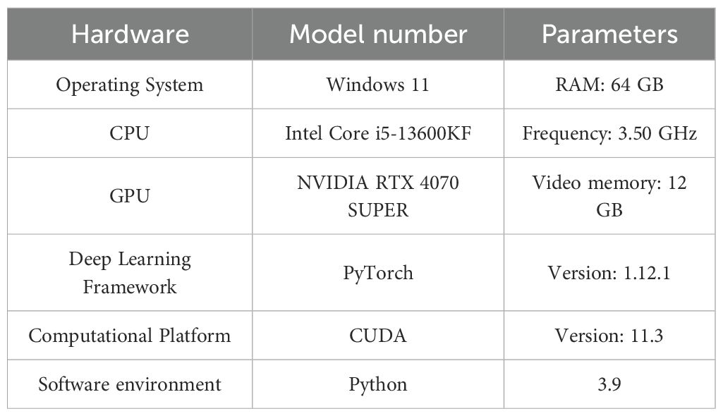The experiments used an NVIDIA RTX 4070 SUPER GPU and Intel Core i5 processor. The software environment used PyTorch deep learning framework with CUDA acceleration. Table 3 provides detailed hardware and software configuration parameters.