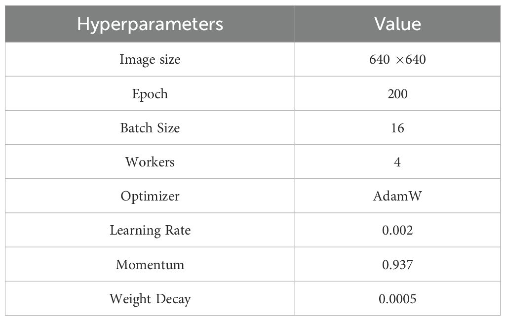 In Equations 9 and 10, True Positive (TP) refers to positive samples correctly classified as positive. False Negative (FN) represents positive samples incorrectly classified as negative, and False Positive (FP) indicates negative samples incorrectly classified as positive. In Equations 11 and 12, is the number of pest species. represents the precision of the i-th pest category, and represents its recall. In Equation 13, denotes the order of magnitude, represents the kernel size, is the number of channels, is the input image size, and is the number of iterations.