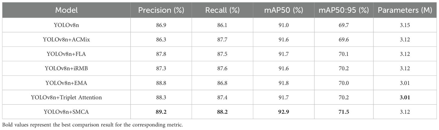 To evaluate the effectiveness of SMCA, YOLOv8n was used as the baseline model, and different attention modules were embedded in C2f within the backbone. Compared attention mechanisms include ACMix (Pan et al., 2022), FLA (Han et al., 2023), iRMB (Zhang et al., 2023), EMA (Ouyang et al., 2023), and Triplet Attention (Misra et al., 2021). Table 5 shows the effects of different attention modules on the model’s detection metrics.