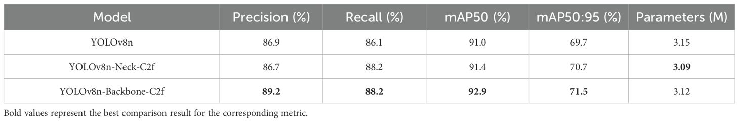 To evaluate the effectiveness of the SMCA mechanism in different model components of the model, this study embeds SMCA into both the Backbone and Neck structures of YOLOv8n and compares the resulting performance metrics. The experimental results are shown in Table 6: