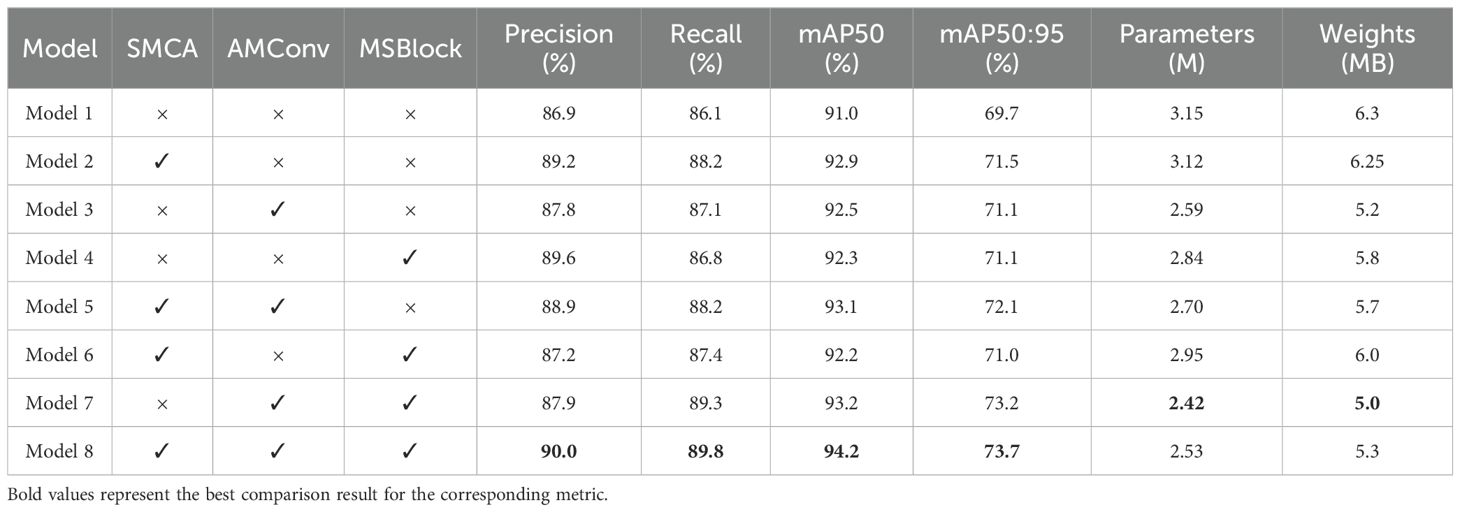 For verifying the performance of SMCA, AMConv, as well as MSBlock for improving YOLOv8n, we conducted ablation studies using the maize pest dataset. Eight models were tested, comparing performance between improved and original models across various metrics. Table 7 presents the experimental results, analyzing the impact of different modules on the model’s performance improvement.