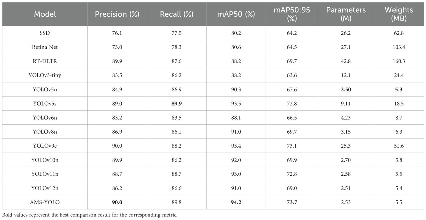 For additional validation of the advantages of the improved AMS-YOLO in maize pest detection, a comprehensive evaluation of 12 mainstream object detection models was conducted, including traditional architectures such as SSD, RetinaNet, RT-DETR, and various YOLO models. The evaluation metrics included Precision, Recall, mAP50, and mAP50:95, as well as model efficiency, Parameters, and Weights. The results are shown in Table 8.