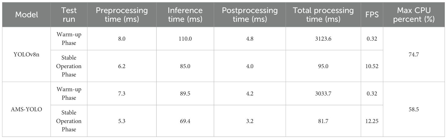 As shown in Table 9, during stable operation, YOLOv8n requires 85.0 ms for inference, with total processing time of 95.0 ms at 10.52 FPS. In contrast, AMS-YOLO reduces inference time to 69.4 ms and total processing time to 81.7 ms, achieving 12.25 FPS. AMS-YOLO improves inference performance by 18.4%, overall processing efficiency by 14.0%, and frame rate by 16.4%. Resource utilization analysis reveals that AMS-YOLO achieves 58.5% CPU utilization during warm-up, markedly lower than YOLOv8n’s 74.7%, demonstrating enhanced resource efficiency through architectural optimization. Lower CPU utilization reduces device heat generation, extends battery life, and decreases overall power consumption.