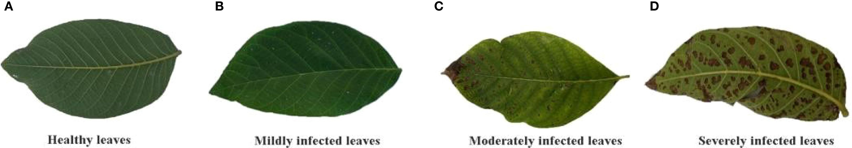 Figure 1. Walnut leaves infected with brown spot disease at different severity levels. (A) Healthy leaves; (B) Mildly infected leaves; (C) Moderately infected leaves; (D) Severely infected leaves.