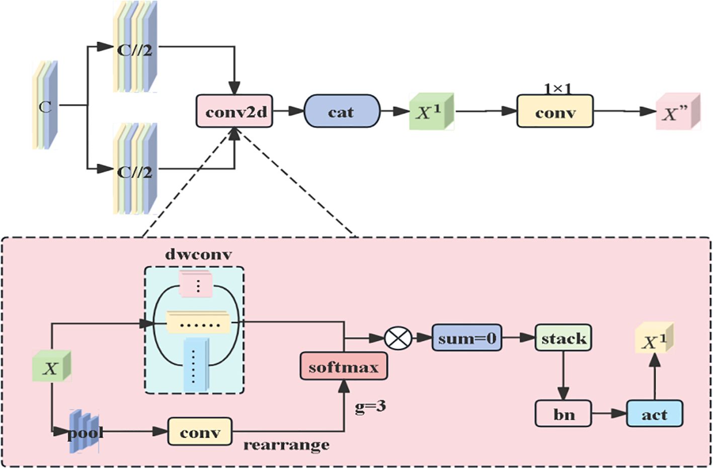 Equation 7 is based on dynamic weights ) for different convolution kernels Weighted fusion is performed on the extracted features. For walnut brown spot lesions exhibiting size heterogeneity and morphological complexity—ranging from early-stage circular micro-lesions to late-stage coalesced irregular lesions—this mechanism adaptively modulates multi-scale feature contributions. It prioritizes retention of morphology-discriminative features, local textures in small lesions or directional distributions in large lesions, thereby comprehensively capturing pathological characteristics across developmental stages. The processed features undergo channel-wise concatenation to generate optimized outputs (Mircetich et al., 1980).