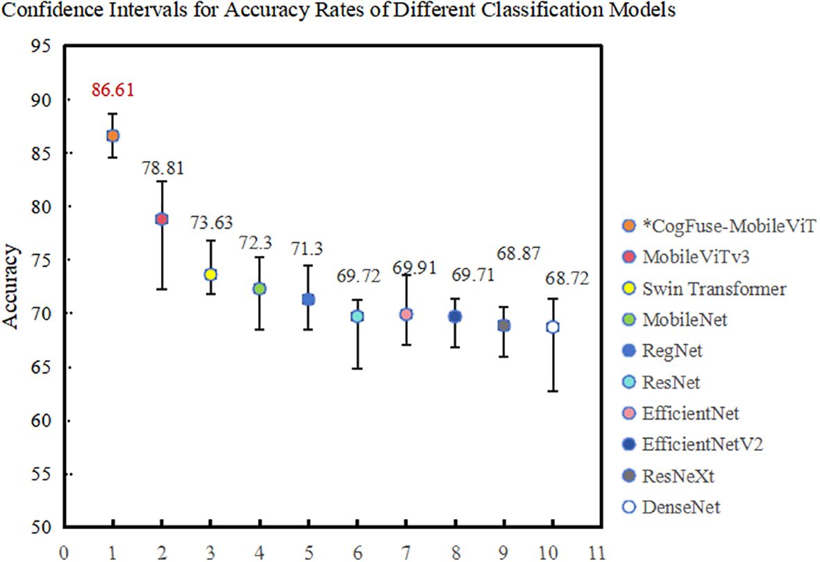 In model training, to quantify the reliability of results and avoid random biases from single experiments, this study employs 5-fold cross-validation to generate 95% confidence intervals, as shown in the Figure 9. The results demonstrate that CogFuse-MobileViT takes a significant lead with an accuracy of 86.61% (95% CI: [85.24%, 87.89%]). Its narrowest confidence interval range indicates the strongest generalization capability. Among the comparative models, MobileViTv3 has a 95% CI of [77.20%, 80.42%]; its lower bound is significantly lower than that of CogFuse-MobileViT, confirming that the 7.8% performance improvement is not due to random fluctuations. Furthermore, the confidence intervals constructed through 5-fold cross-validation further highlight the reliability of the experimental results.