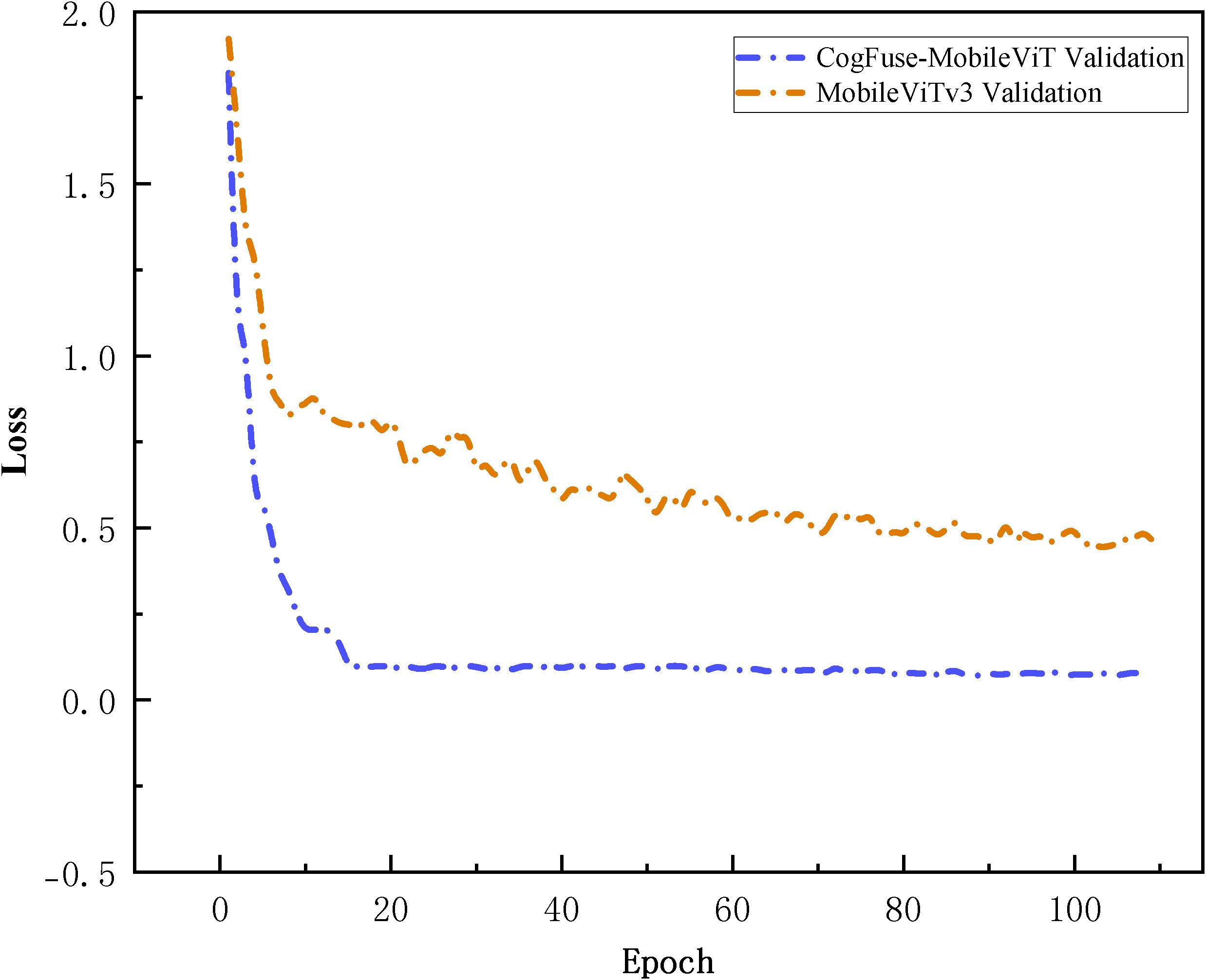 Under 5-fold cross-validation (Figure 10), CogFuse-MobileViT achieves rapid convergence within the first 20 epochs, demonstrating more efficient feature learning capability. Upon entering the steady-state phase, its validation loss is reduced by over 5-fold compared to the baseline MobileViTv3, directly confirming smaller prediction errors and superior generalization capability. Meanwhile, the smooth and minimally fluctuating loss curve of CogFuse-MobileViT reflects strong robustness against data noise and distribution variations. Combined with the previous statistical findings from accuracy confidence intervals and independent t-tests, these results collectively validate the statistical significance of the improved model.