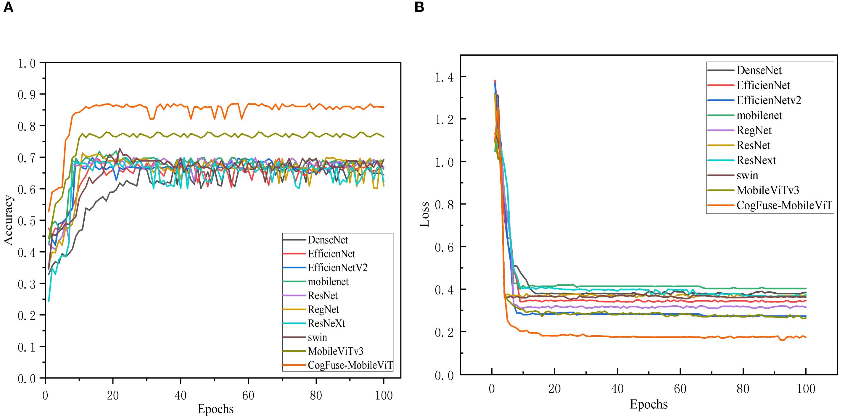 In Figure 11B, all models showed high initial loss values that dropped rapidly and then stabilized, following the typical learning process of iterative optimization. CogFuse-MobileViT achieved significant early loss decline and stabilized near the minimum, indicating efficient feature learning and strong fitting capability. While DenseNet also reached a relatively low loss level, it remained slightly higher than CogFuse-MobileViT. Other models had higher late-stage loss values: some showed fast initial decline but converged to higher levels, indicating shortcomings in capturing key disease features.