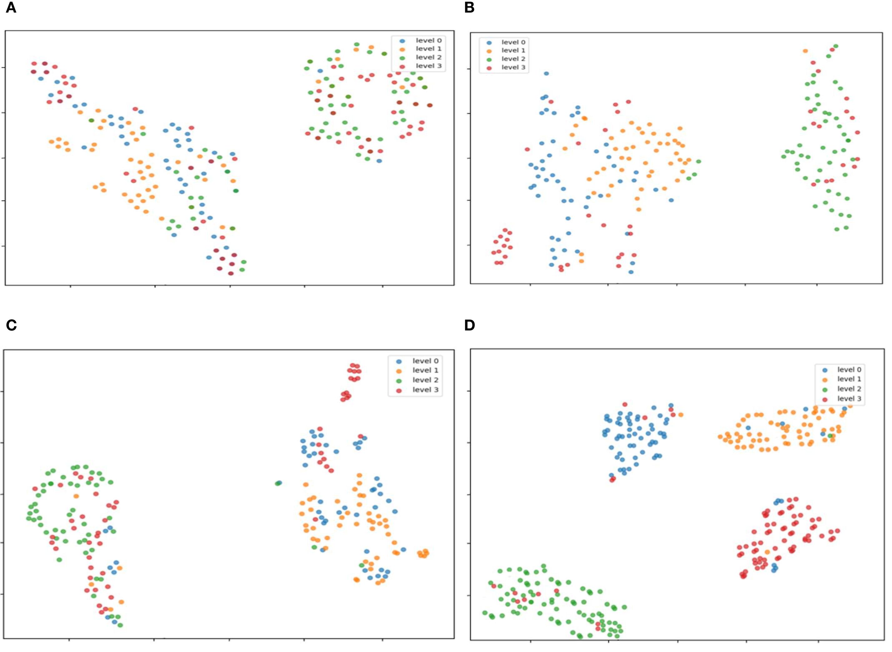 Figure 14. TSNE visualization of features extracted by different models. After the three modules work synergistically, the boundaries of feature clustering between Level 0 (healthy) and Level 1 (early-stage) are significantly clearer, which verifies the effectiveness of edge-texture collaborative learning (A) The original model was trained for 20 epochs; (B) The original model was trained for 50 epochs; (C) The original model was trained for 100 epochs; (D) The improved model was trained for 100 epochs.