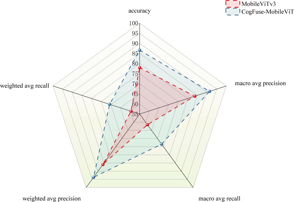 As shown in Figure 15, a radar chart compares the performance of the original model and the improved CogFuse-MobileViT model across multiple evaluation metrics. In terms of accuracy, CogFuse-MobileViT exhibits significantly higher values than the original MobileViTv3 model, indicating that the improved model achieves overall higher classification accuracy. Macro-average precision, which considers the average precision of each category, clearly shows that CogFuse-MobileViT also performs better, meaning it has superior precision across all categories. Meanwhile, CogFuse-MobileViT also demonstrates better macro-average recall. When examining weighted-average precision and weighted-average recall—metrics that account for class imbalance—CogFuse-MobileViT outperforms MobileViTv3 in both, indicating that in practical applications, even with uneven class distribution, the CogFuse-MobileViT model can deliver better performance. These results further demonstrate the model’s reliability and practicality.