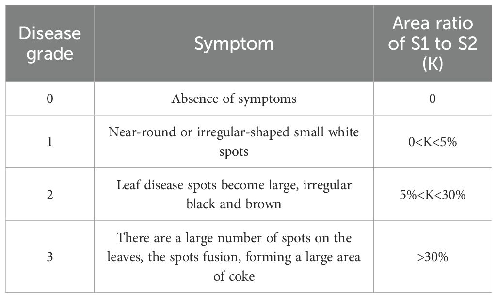 In the local standard Technical Regulations for Prevention and Control of Walnut Brown Spot (McGranahan and Leslie, 1991), walnut brown spot is divided into four severity levels. The severity of plant leaf diseases is generally determined using the spot coverage method. In this study, walnut leaves with different disease severities were processed to separate disease-infected spots from healthy leaf areas, and the percentage of lesion area to total leaf area was calculated. With reference to the local standard, the disease grades specified in the standard were re-determined through calculations in this study, as shown in Table 1. Classification of different severity levels of walnut leaf brown spot was conducted in accordance with Technical Regulations for Prevention and Control of Walnut Brown Spot (Wang et al., 2022; Yang et al., 2021).