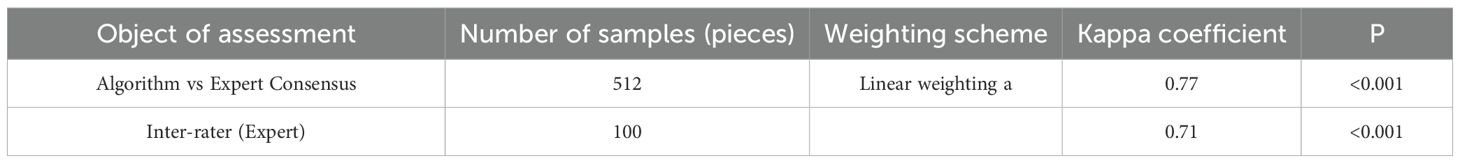 Disease severity grading was established through quantitative lesion area analysis (Figure 2). A representative subset of 512 images (10% of the full 5,120-image dataset) was selected via stratified random sampling, accurately preserving the original severity distribution. To ensure labeling rigor, two plant protection specialists (>5 years’ expertise in walnut pathology, certified in local protocols) executed standardized annotation: Pre-annotation training unified diagnostic criteria for ambiguous cases, with formal annotation commencing only after achieving pre-calibration inter-rater agreement (Kappa coefficient ≥0.75). As validated in Table 2, dual statistical metrics confirmed gold-standard reliability—inter-rater Cohen’s Kappa reached 0.71, meeting Landis & Koch’s “substantial agreement” threshold; algorithm-expert consensus attained a weighted Fleiss’ Kappa of 0.77, substantially outperforming conventional Cohen’s Kappa in multi-annotator scenarios. A three-stage standardization pipeline eliminated preprocessing discrepancies. The final dataset, partitioned into training/testing sets (8:2 ratio), strictly adheres to plant disease survey protocols and provides benchmarked data for deep learning model development (Table 3).