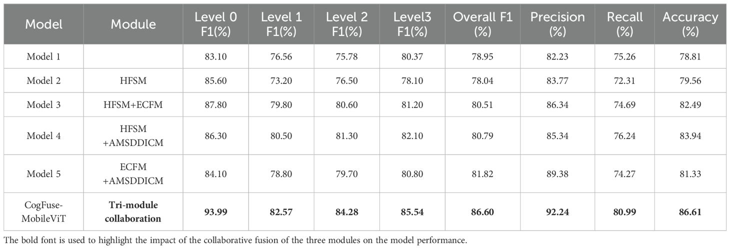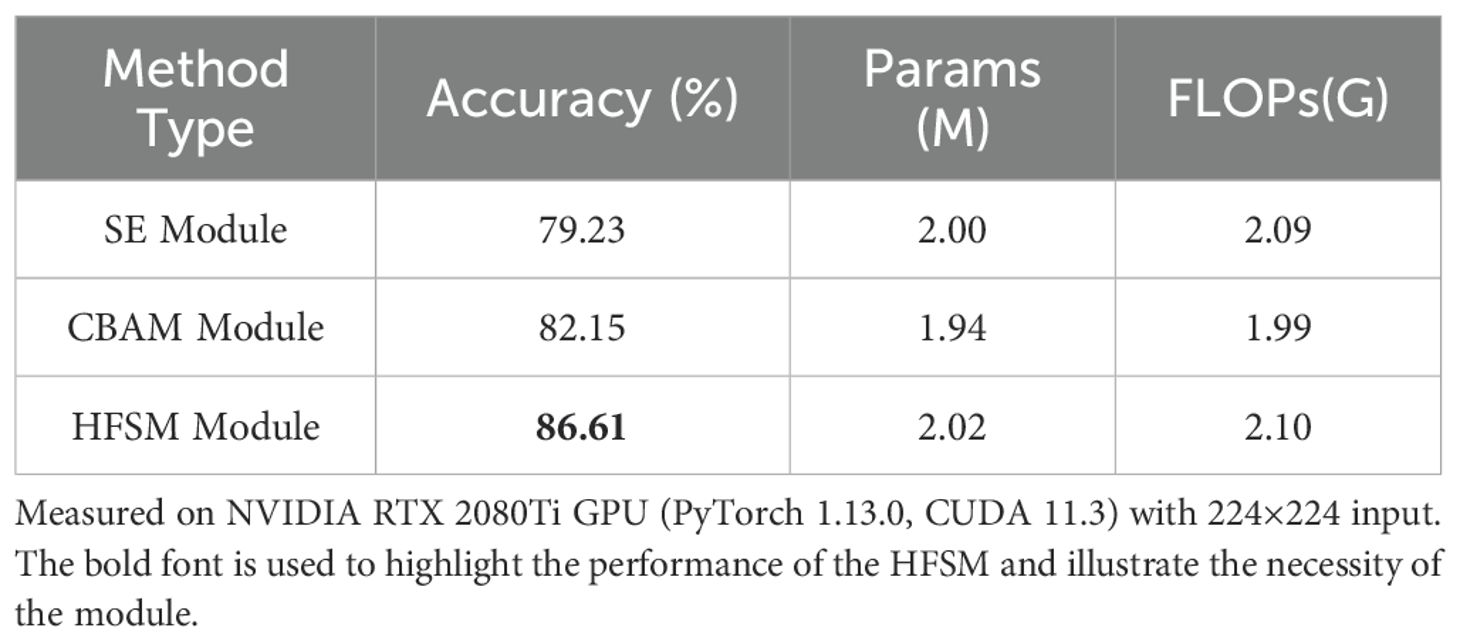 To validate the necessity of the Hierarchical Feature Selection Module (HFSM) within the CogFuse-MobileViT framework, this study conducted comparative tests against two mainstream lightweight attention modules: SE (Squeeze-and-Excitation) and CBAM (Convolutional Block Attention Module). As illustrated in Table 4, the HFSM module achieves a significantly higher accuracy of 86.61%, outperforming the SE module and CBAM module by 7.38% and 4.46%, respectively. This demonstrates that its hierarchical feature selection mechanism more effectively captures discriminative features. In terms of computational efficiency, the parameters and FLOPs of HFSM remain comparable with those of the SE module and CBAM module, indicating that its performance breakthrough stems from innovative structural design under equivalent lightweight constraints. Comprehensive results confirm that replacing HFSM with SE or CBAM modules would incur a performance degradation exceeding 4%, thereby validating the indispensable value of HFSM in enabling efficient feature selection within the CogFuse-MobileViT framework.