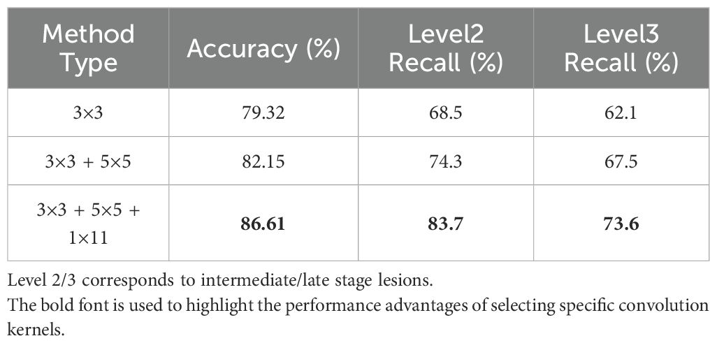 Rigorous validation via kernel combination ablation studies (Table 5) demonstrates. The hybrid configuration (3×3 + 5×5 + 1×11) significantly outperformed square-only kernels (3×3 + 5×5) Accuracy 86.61% and 82.15% Stage-specific recall gains. Mid-stage lesions (Level 2) raise 9.4 percentage points. Late-stage lesions (Level 3) raise 6.1 percentage points. This empirically validates the necessity of 1×11 rectangular kernels for capturing linear pathological features, overcoming the limitation of isotropic kernels in detecting anisotropic structures.