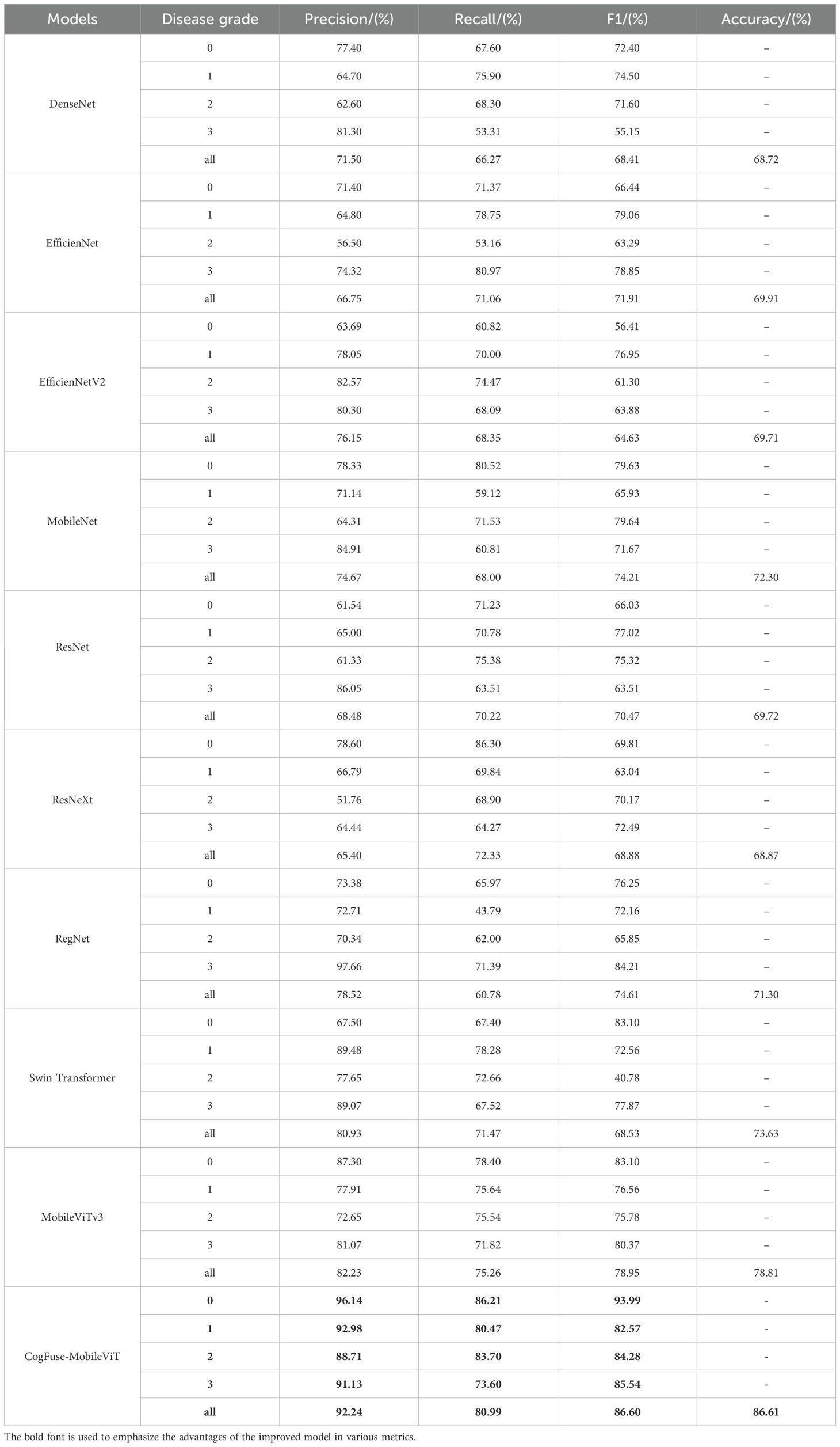 To verify the effectiveness of the CogFuse-MobileViT model, we selected 9 commonly used classification models to compare with the optimized CogFuse-MobileViT model, and the results are the average of 5-fold cross-validation over 120 epochs. As shown in Table 7, the proposed CogFuse-MobileViT model achieved the highest grading performance in terms of Precision, Recall, and F1-score for identifying walnut leaf brown spot disease at different severity levels among all compared models. The improved CogFuse-MobileViT model exhibits an accuracy of 86.61%, representing a 7.80-percentage-point improvement over the original model. Overall, the experimental results highlight that the enhanced CogFuse-MobileViT model is more conducive to focusing on lesion edge details and accurately learning the features of different severity levels of walnut leaf brown spot disease, thereby improving the model’s classification performance.