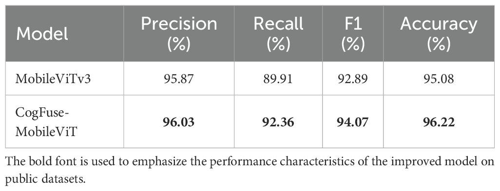 To further validate the efficacy and generalizability of the proposed CogFuse-MobileViT model, experiments were conducted on the public dataset AppleLeaf9 (Yang et al., 2022). This dataset comprises healthy apple leaves and eight categories of apple leaf diseases captured in field environments without restrictions on imaging angles or noise interference. The dataset was partitioned into training and test sets at an 8:2 ratio. All images were resized to 224×224 pixels to optimize deep learning model training efficiency. Following the hyperparameter configurations specified in “Experimental Parameters and Evaluation Metrics”, both the baseline MobileViTv3 and CogFuse-MobileViT models were trained and evaluated.