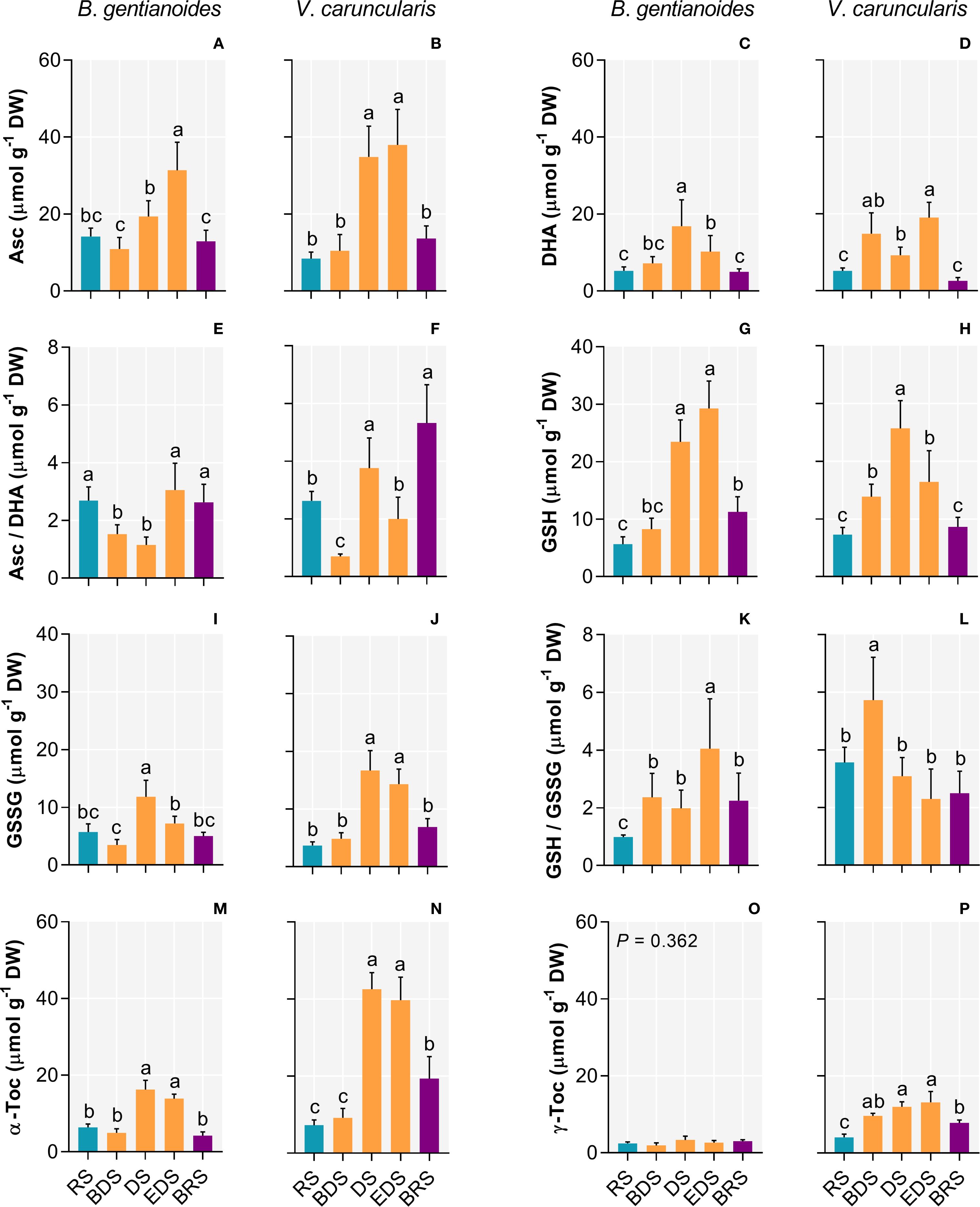 Figure 4. Antioxidant compounds in the co-occurring species B. gentianoides and V. caruncularis growing under field conditions during the seasonal cycle. (A, B) Ascorbate (Asc); (C, D) Dehydroascorbate (DHA); (E, F) Asc/DHA ratio (G, H) Reduced glutathione (GSH); (I, J) Oxidized glutathione (GSSG); (K, L) GSH/GSSG ratio; (M, N) α-Tocopherol and (O, P) γ-Tocopherol concentrations. RS, rainy season; BDS, beginning of the dry season; DS, dry season; EDS, end of the dry season; BRS, beginning of the rainy season. (n = 10). Lowercase letters indicate a significant difference (one-way ANOVA, Tukey test P<0.05) among the distinct seasons.