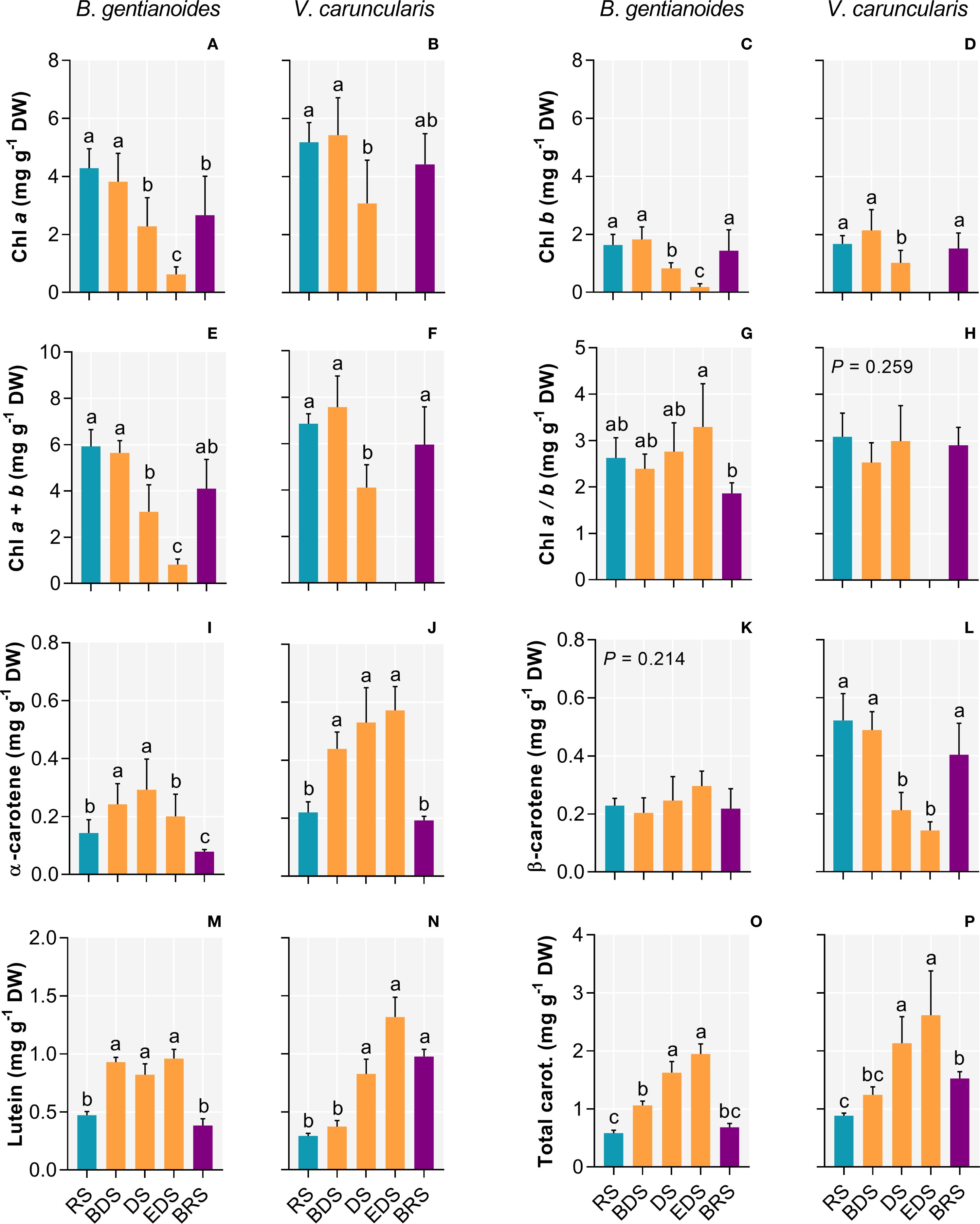Figure 5. Chlorophylls and carotenoids in the co-occurring species B. gentianoides and V. caruncularis growing under field conditions during the seasonal cycle. (A, B) Chlorophyll a (Chl a); (C, D) Chlorophyll b (Chl b); (E, F) Chl a + Chl b; (G, H) Chl a/Chl b ratio; (I, J) α-Carotene; (K, L) β-Carotene; (M, N) Lutein and (O, P) Total carotenoids concentrations. RS, rainy season; BDS, beginning of the dry season; DS, dry season; EDS, end of the dry season; BRS, beginning of the rainy season (n = 10). Lowercase letters indicate a significant difference (one-way ANOVA, Tukey test P<0.05) among the distinct seasons.