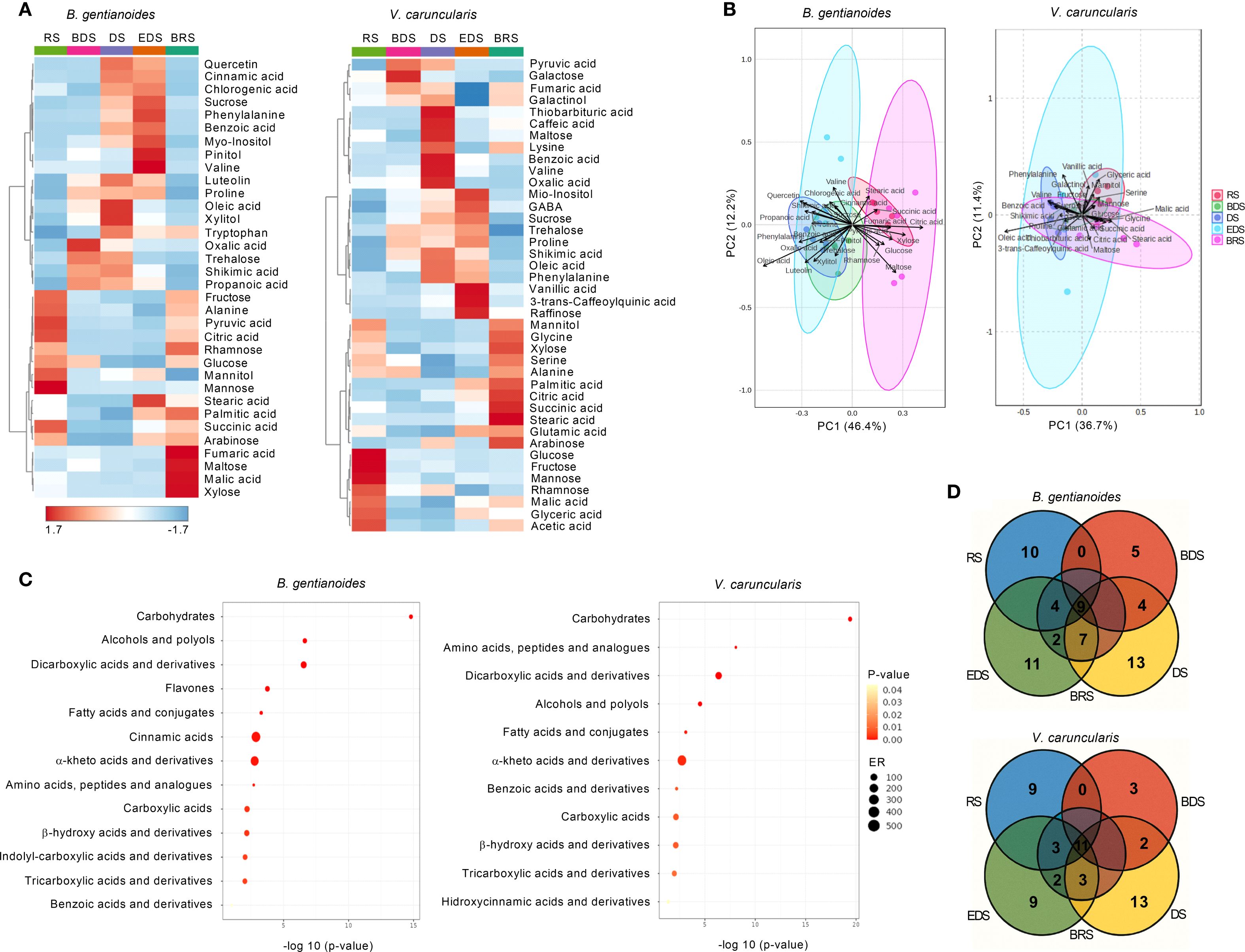 Figure 7. Metabolic profiling in the co-occurring species B. gentianoides and V. caruncularis growing under field conditions during the seasonal cycle. (A) Comparative heatmap showing metabolic reprogramming during drought acclimation and dehydration stress in both species. The intensity of each metabolite peak for all samples represents the mean of each treatment. Colours represent abundance (red, significantly higher than control; blue, significantly lower than control; lighter, no significant changes) by Tukey’s test (p < 0.05). (B) Principal components analysis (PCA) of the metabolic profiling showing the clustering of major compounds responsive to the dehydration–rehydration cycle. (C) Enrichment analysis identifying key compound groups associated with drought acclimation; (D) Venn diagrams displaying the overlap of upregulated compounds at each time point across different seasons. RS, rainy season; BDS, beginning of the dry season; DS, dry season; EDS, end of the dry season; BRS, beginning of the rainy season; ER, enrichment ratio (n = 10).