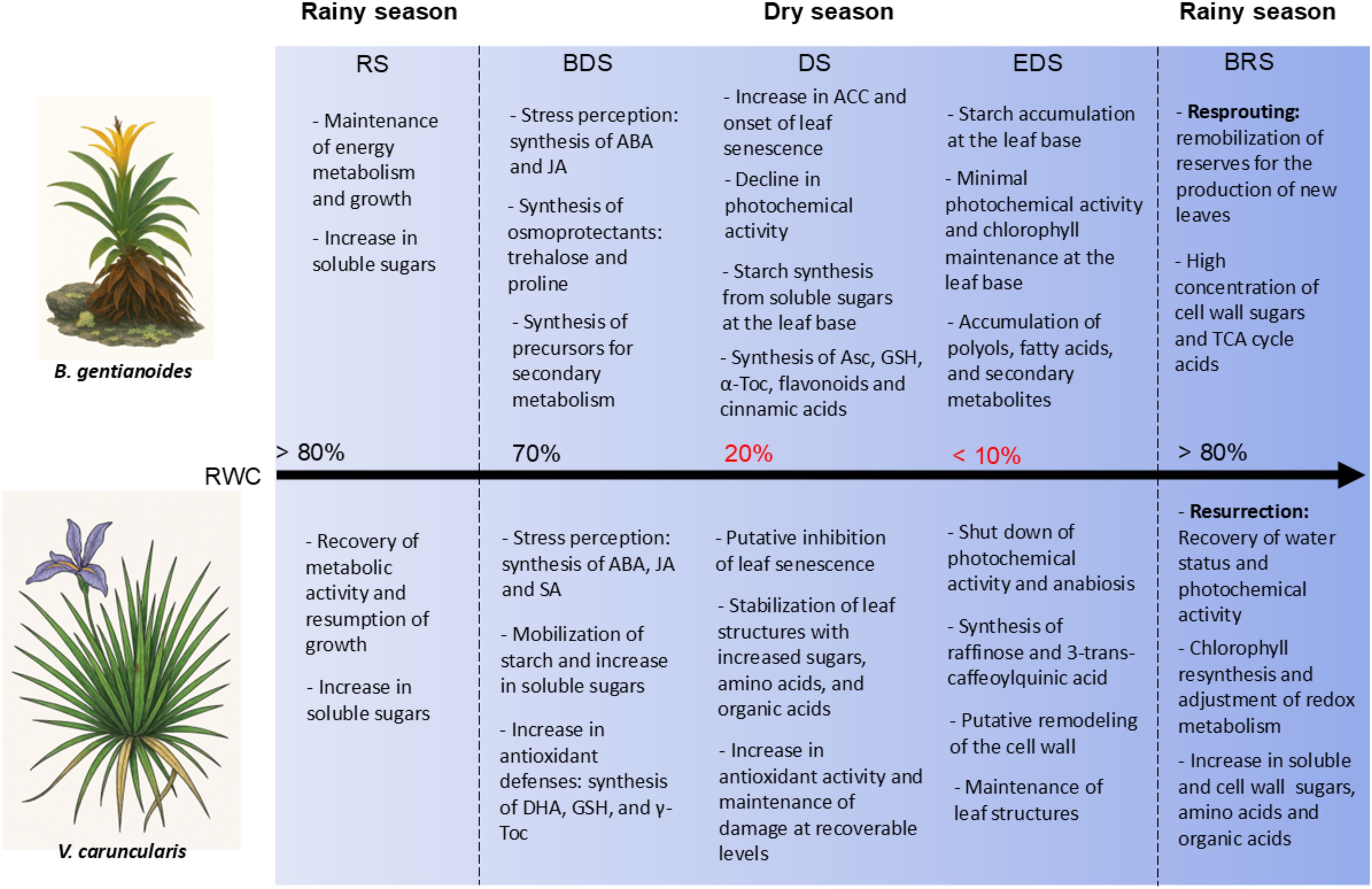 Figure 9. The schematic model summarizing physiological and metabolic responses to drought and desiccation in the co-occurring species B. gentianoides and V. caruncularis growing under field conditions during the seasonal cycle. RS, rainy season; BDS, beginning of the dry season; DS, dry season; EDS, end of the dry season; BRS, beginning of the rainy season.