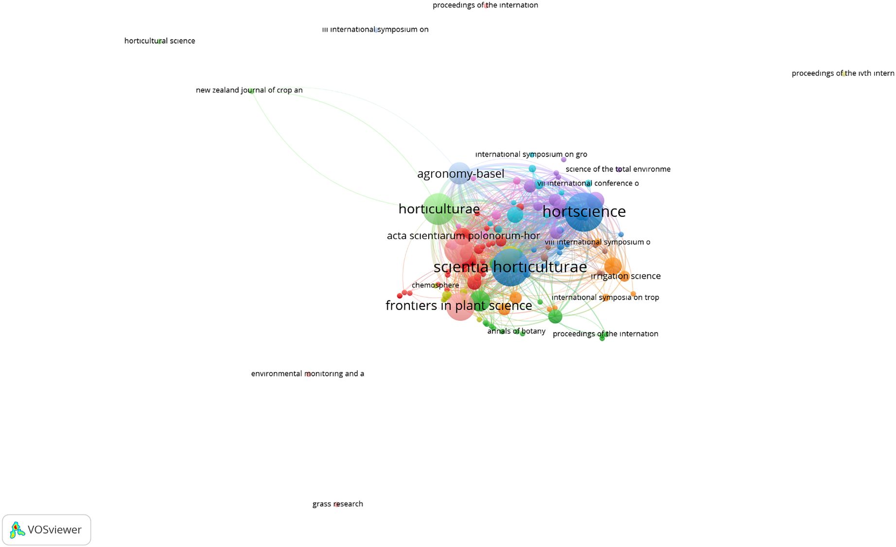 ![Network visualization showing clusters of interconnected terms related to horticulture and plant sciences. Central terms like “hortscience” and “scientia horticulturae” are prominent, connected to smaller terms like “irrigation science” and “agronomy-basel.” Colored nodes and lines indicate varying degrees of connection and clustering within the network. Network visualization generated with VOSviewer; node size reflects [occurrences/citations], link thickness reflects link strength; colors denote clusters.](https://www.frontiersin.org/files/Articles/1644092/fpls-16-1644092-HTML/image_m/fpls-16-1644092-g005.jpg)