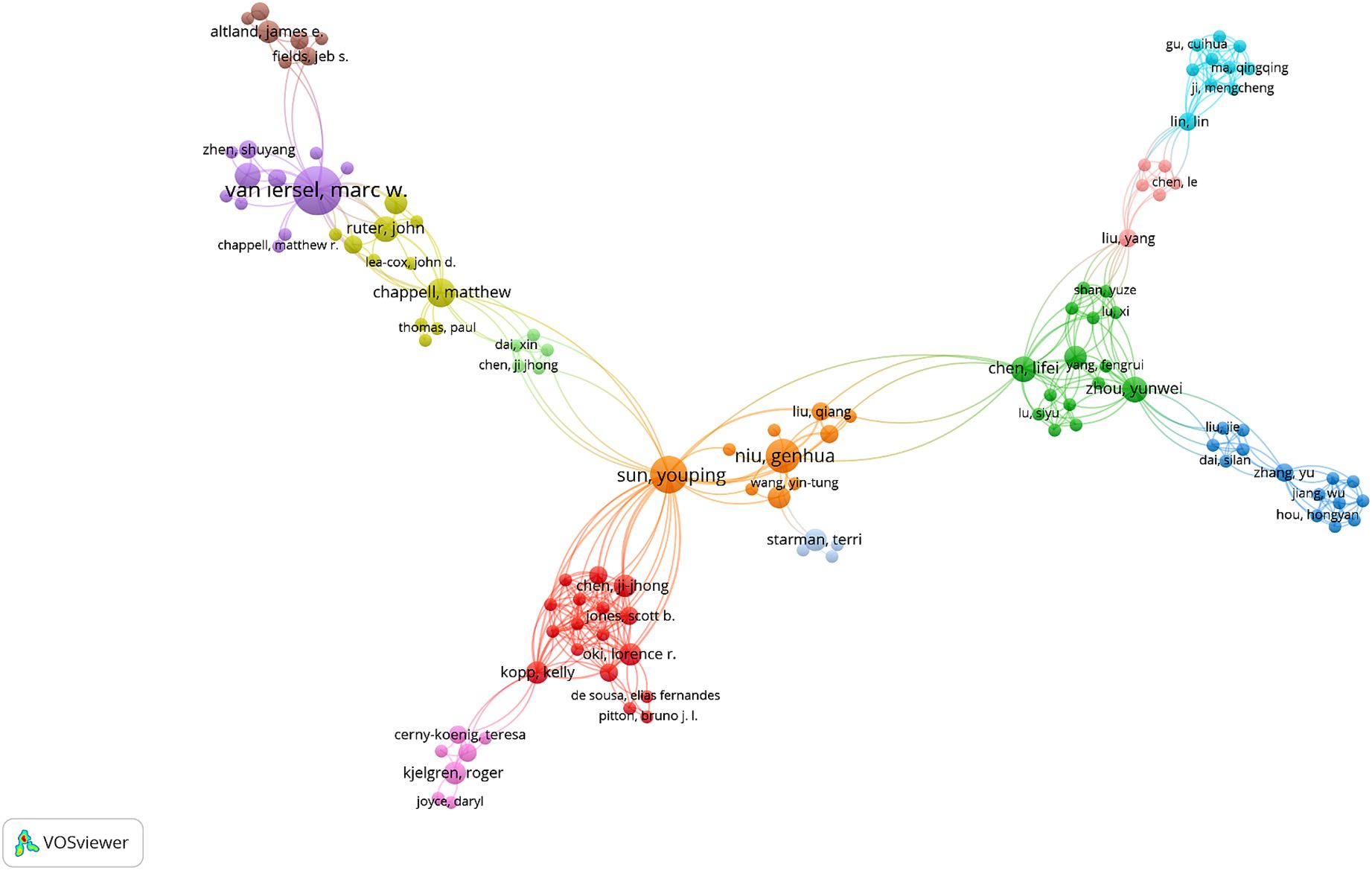 The co-authorship network presented in Figure 6 reveals the structural dynamics of author collaborations in the field of drought stress and ornamental plants. The visualization identifies several well-defined clusters, each representing distinct research communities that frequently collaborate on publications within this domain. The most prominent node, Sun Youping, appears as a central hub connecting multiple author groups, indicating a high level of productivity and cross-group collaboration. Surrounding this node are secondary clusters led by Niu Genhua and Kopittke Peter M., whose co-authorship patterns suggest stable, long-term collaborations often confined within their institutional or regional affiliations. Other notable clusters include van Iersel Marc W. and Chen Jie, both of whom anchor independent author networks with relatively strong intra-group cohesion but limited cross-linkages to other clusters. This structural feature may reflect thematic specialization or geographic concentration in collaborative practices. The overall structure of the network of the network exhibits a combination of centralized and clustered traits, where a few prolific researchers serve as bridges between otherwise discrete author groups. Such a configuration supports efficient information flow across subfields, while still maintaining specialized research foci within individual clusters. The analysis reveals both integrative and fragmented aspects of current research collaboration. While certain researchers contribute to broader academic cohesion, some clusters remain isolated. Promoting stronger ties across regions and institutions may drive more innovative and diverse approaches in upcoming research on drought stress in ornamentals.