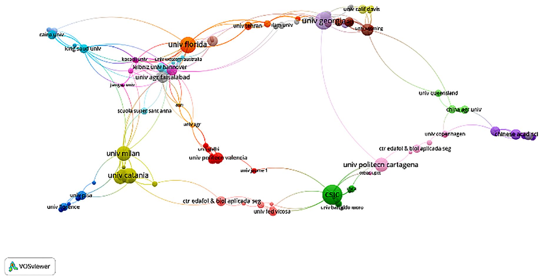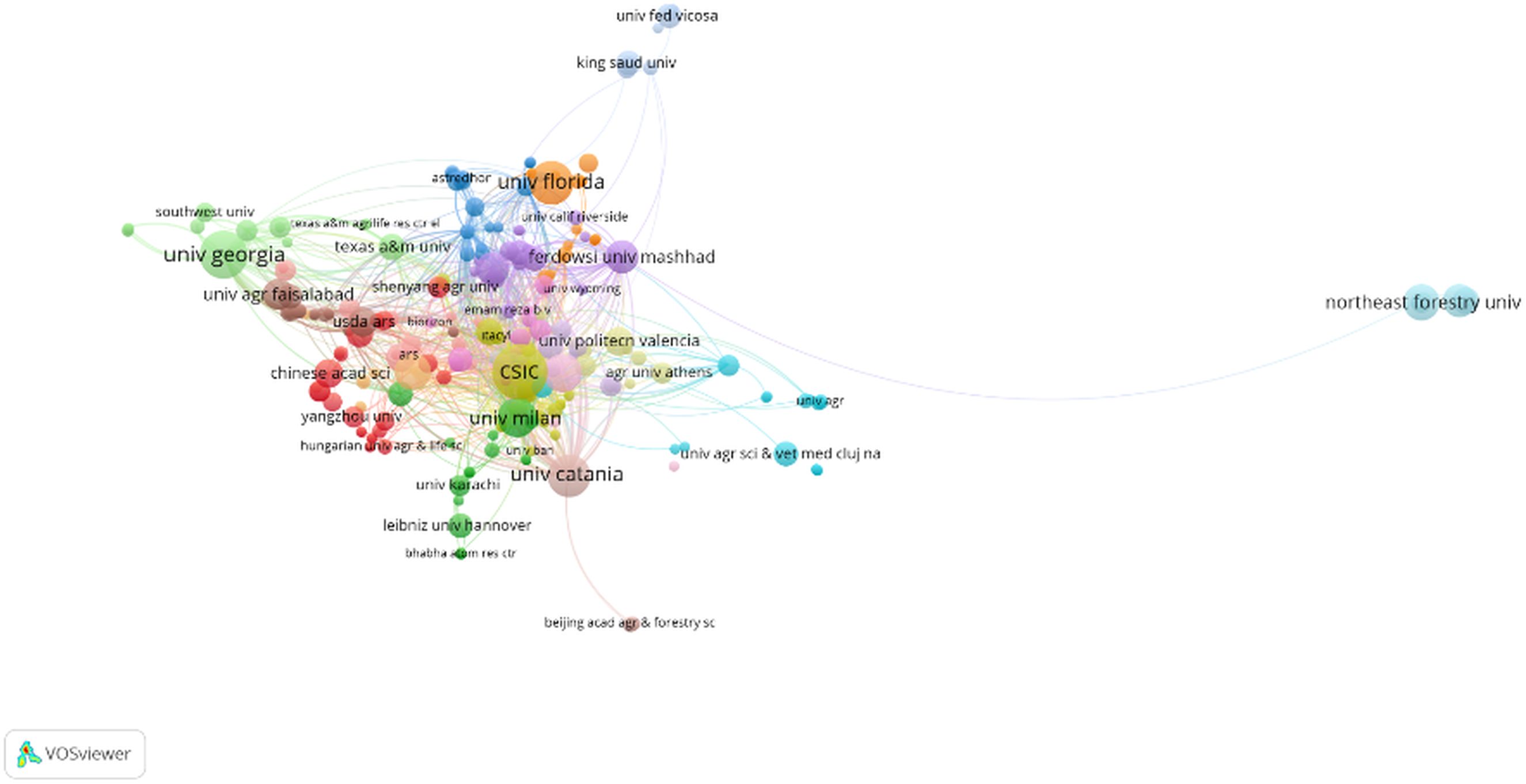 ![Network visualization diagram created with VOSviewer showing interconnected nodes representing various universities and research institutions. Nodes are colored and sized according to their connections, displaying a complex web of associations. Labels include universities like “univ florida,” “univ georgia,” “univ milan,” and “univ politenc cartagena,” illustrating academic collaborations. Network visualization generated with VOSviewer; node size reflects [occurrences/citations], link thickness reflects link strength; colors denote clusters.](https://www.frontiersin.org/files/Articles/1644092/fpls-16-1644092-HTML/image_m/fpls-16-1644092-g007.jpg)