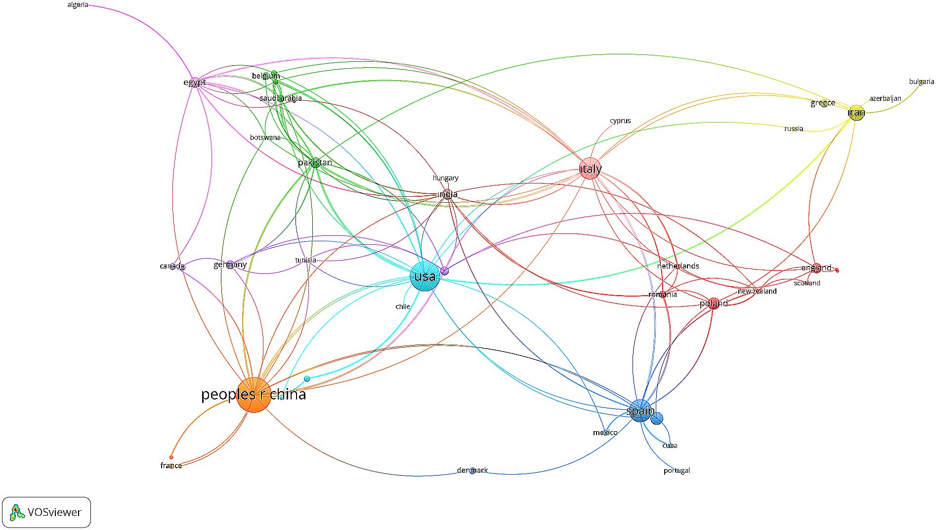 Further analysis of the country co-authorship network revealed a highly collaborative structure, particularly from 2010 onwards. As shown in Figure 9, China, the United States, and Spain emerged as the most central countries, forming dense clusters of international collaboration. These countries maintain extensive international collaborations spanning Europe, Asia, and Africa, underscoring their leading role in drought stress research within ornamental horticulture. Other notable contributors include Italy, Iran, and Pakistan, which also exhibited multiple international linkages. The international collaborations observed such as China–France, USA–Chile, and Spain–Mexico—demonstrate that water stress in ornamental horticulture is a shared global challenge.