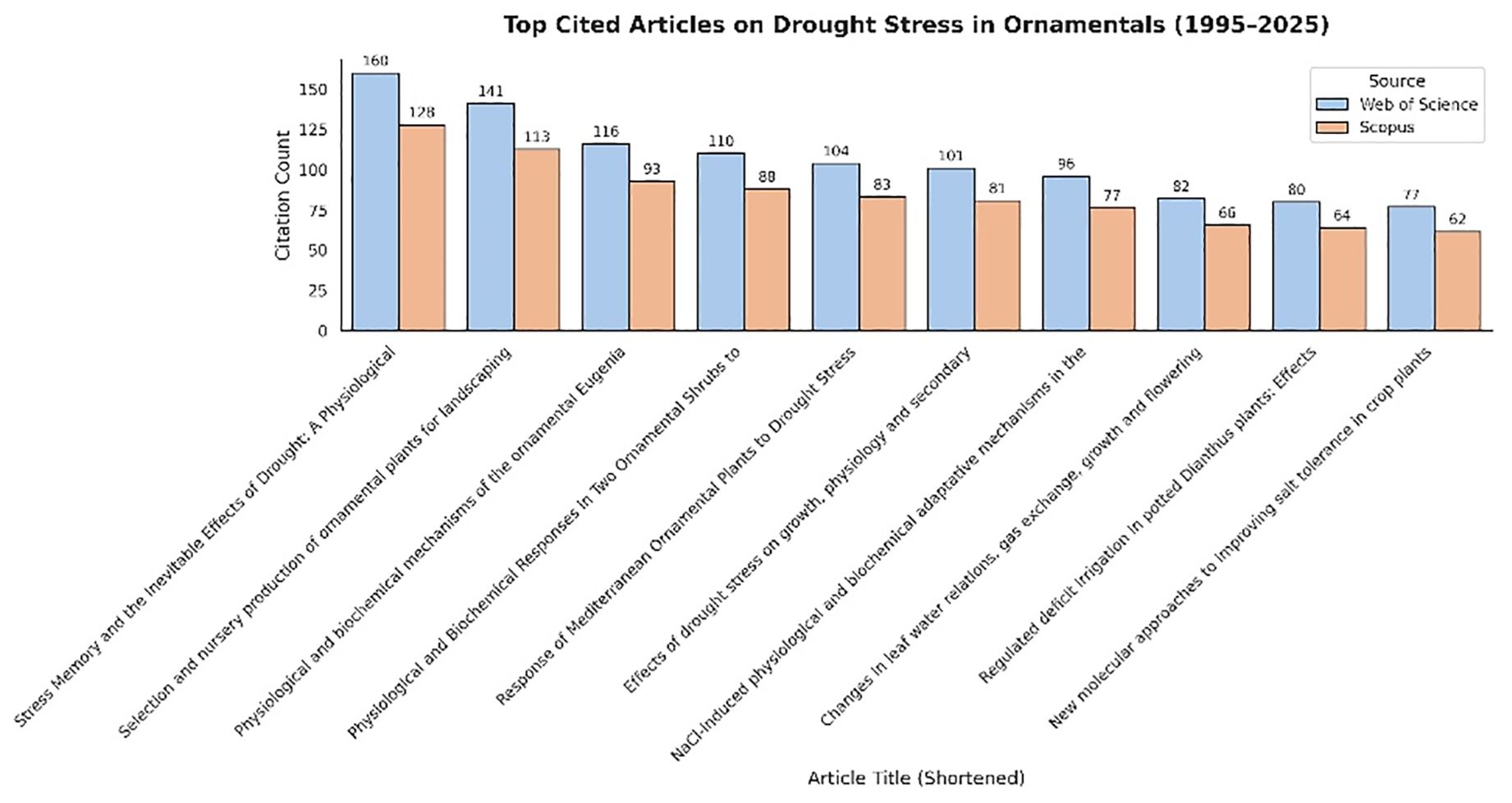 The citation patterns identified in this study highlight the maturation and concentration of scholarly focus of drought stress research within ornamental horticulture (Figure 10). The most frequently cited articles, primarily published in journals such as Frontiers in Plant Science, Scientia Horticulturae, and Journal of Horticultural Science and Biotechnology, consistently address physiological and biochemical adaptation mechanisms to drought conditions. This citation concentration suggests that the academic community places high value on studies elucidating stress-responsive pathways and tolerance traits in ornamental species. Such works not only enhance fundamental understanding but also provide practical insights for nursery selection and landscape management under water-limited environments. An analysis of the most frequently cited articles in the field of drought stress and ornamental plants was conducted using bibliometric data extracted from Web of Science and Scopus for the period 1995–2025. Figure 10 presents a comparative overview of citation counts for the top 10 most cited publications across both databases. While the ranking of key publications remains largely consistent between the two sources, Web of Science tends to report higher citation values for most documents. This discrepancy may reflect differences in indexing coverage, update frequency, and inclusion criteria between the databases. For example, the article by Fleta-Soriano and Munné-Bosch (2016), addressing drought stress memory in plants, has received over 160 citations in Web of Science, whereas Scopus lists 128 citations, indicating a difference in database coverage. Thematically, highly cited articles predominantly focus on physiological adaptation mechanisms, stress tolerance traits, and biochemical responses of ornamental species under water deficit conditions. These core topics appear to form the conceptual backbone of research in this area, consistently attracting scholarly attention and shaping future inquiry. The citation analysis shows that studies combining practical applications with an understanding of plant responses—particularly in Mediterranean and landscape ornamentals—tend to receive more citations. This highlights the growing importance of climate resilience research in ornamental horticulture, especially in the context of water scarcity and increasing environmental variability.