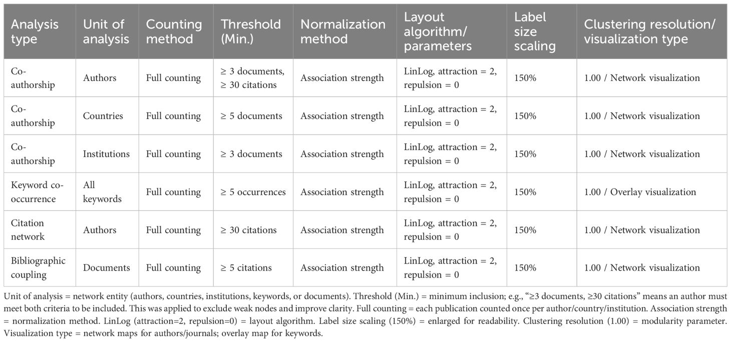 All bibliometric network analyses were conducted using VOSviewer version 1.6.20 (Leiden University, The Netherlands). Separate analyses were performed for co-authorship (authors, countries, institutions), keyword co-occurrence, and citation/bibliographic coupling. Full counting was applied unless otherwise indicated. The association strength method was used for normalization across all analyses. The LinLog/modularity optimization layout algorithm was applied with attraction = 2 and repulsion = 0 to optimize network clarity. Label size scaling was set to 150% to enhance readability, and clustering resolution was maintained at 1.00. Minimum threshold values for inclusion were determined based on network density and visualization clarity, as summarized in Table 1.
