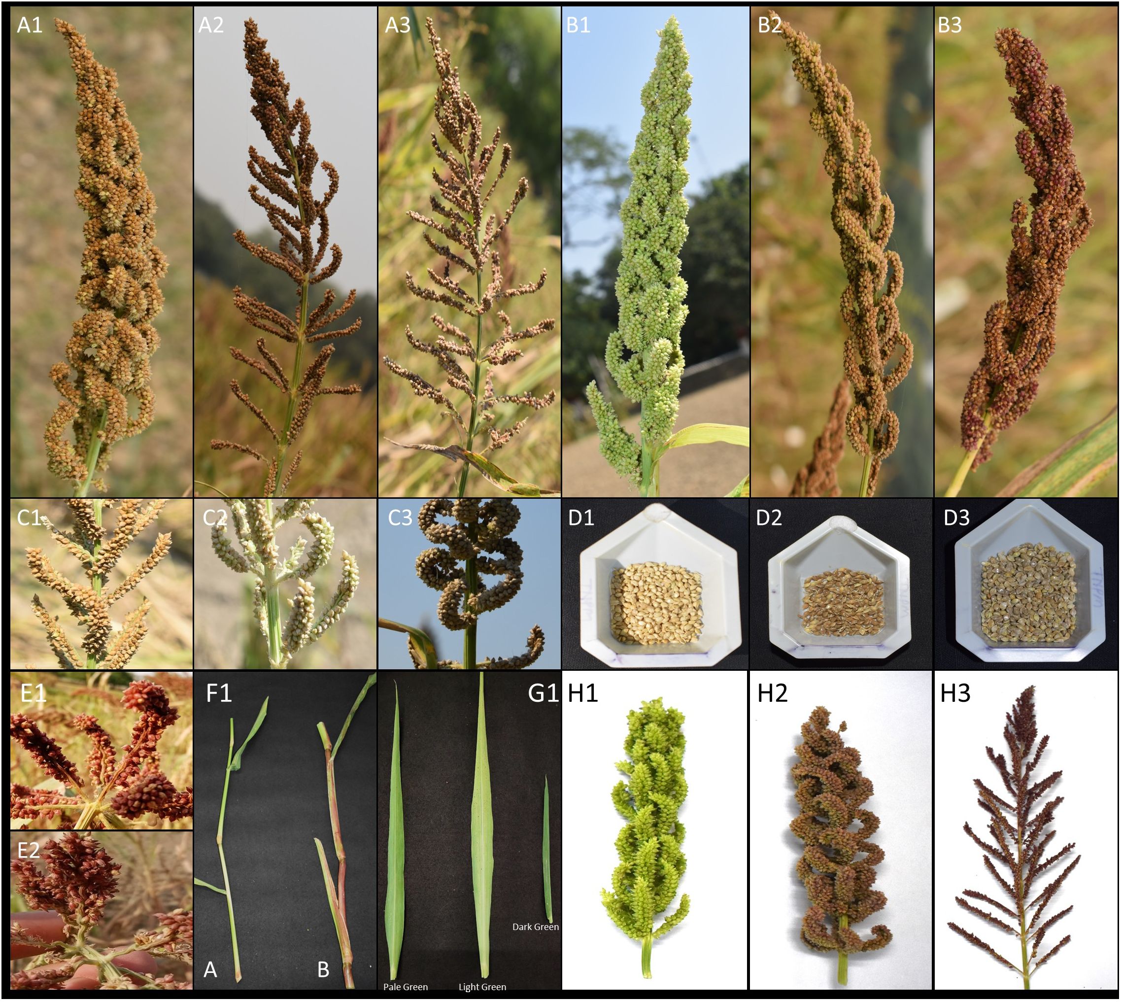 Figure 2. Picture representing the descriptors used in characterization of INGB barnyard millet collection. A (Inflorescence compactness): A1, Compact; A2, Intermediate; A3, Open. B (Inflorescence Colour): B1, Green; B2, Light Purple; B3, Dark Purple. C (Shape of Lower Raceme): C1, straight; C2, Curved; C3, Slender. D (Grain colour): D1, Straw White; D2, Light Grey; D3 Grey. E (Branching of Lower Raceme): E1, Absent; E2, Present. F (Plant Pigmentation): F1 A, Absent; F1 B, Present; G (Leaf Color), Pale green, Light Green and Dark green. H (Inflorescence Shape): H1, Cylinder; H2, Globose; H3, Pyramidical.