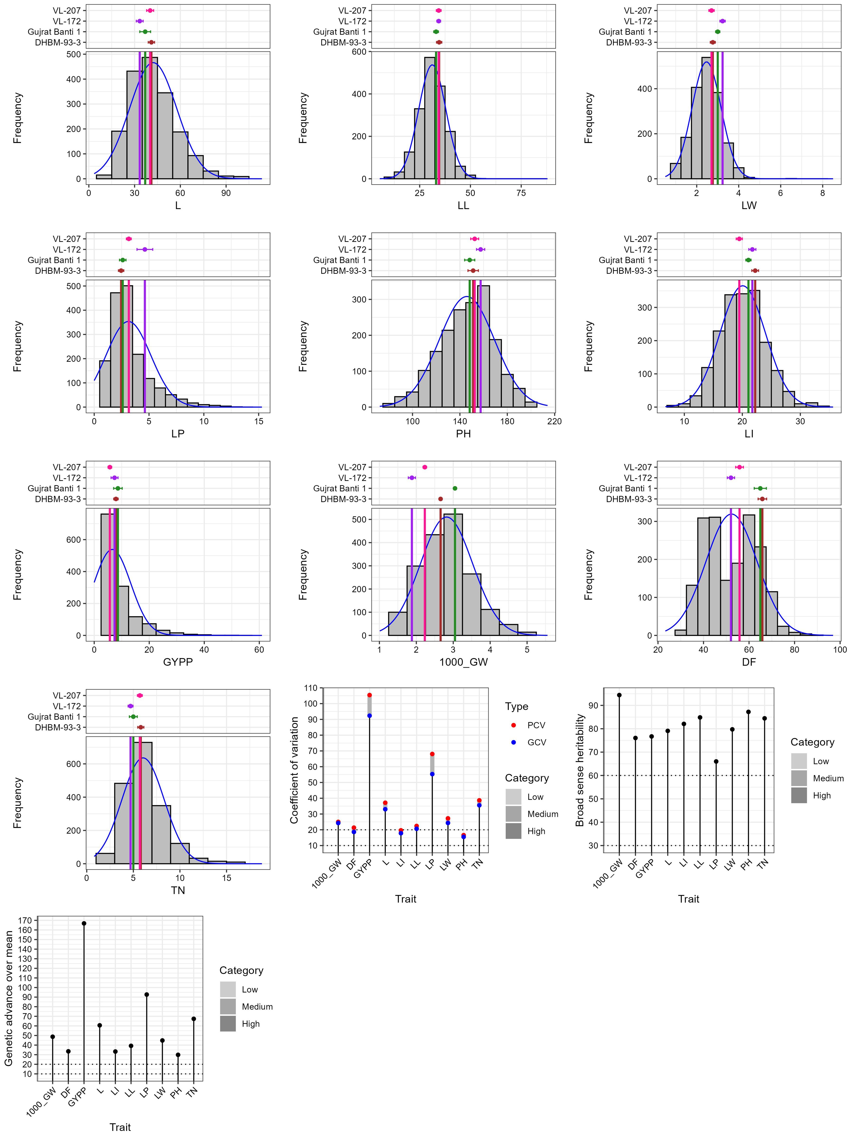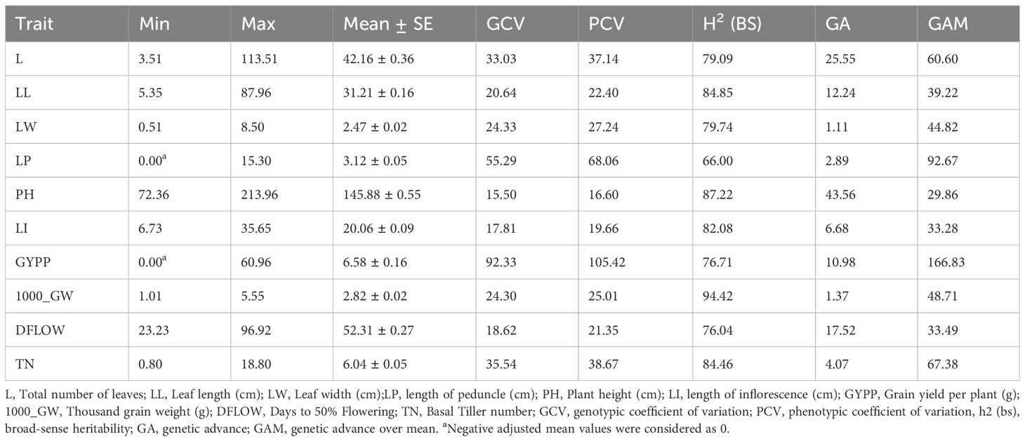 Wide variation was recorded among the accessions as evident from frequency distribution plot for the 10 quantitative traits (Figure 4) and general statistical analysis (Table 2). The total number of leaves (L) ranged from 3.51 to 113.51 with a mean of 42.16 ± 0.36. Leaf length (LL) showed a range of 5.35 to 87.96 cm, with a mean of 31.21 ± 0.16 cm. Leaf width (LW) exhibited moderate variability with a range of 0.51 to 8.50 cm and a mean of 2.47 ± 0.02 cm. The length of the peduncle (LP) ranged from 0.00 to 15.30 cm, with a mean of 3.12 ± 0.05 cm. Plant height (PH) ranged from 72.36 to 213.96 cm, with an average of 145.88 ± 0.55 cm. Similarly, length of inflorescence (LI) ranged from 6.73 to 35.65 cm, with a mean of 20.06 ± 0.09 cm and high heritability (82.08%), suggesting a strong genetic basis for the trait. Grain yield per plant (GYPP) exhibited the greatest variability among all traits, ranging from 0.00 to 60.96 g with a mean of 6.58 ± 0.16 g. Thousand grain weight (1000_GW) ranged from 1.01 to 5.55 g, with a mean of 2.82 ± 0.02 g. Days to 50% flowering (DFLOW) ranged from 23.23 to 96.92, with a mean of 52.31 ± 0.27 days. Finally, basal tiller number (TN) varied from 0.80 to 18.80, with a mean of 6.04 ± 0.05. Overall, traits such as GYPP, LP, TN, and 1000_GW demonstrated high variability coupled with high heritability and genetic advance, indicating their utility for selection and genetic improvement. In contrast, traits like PH and DFLOW showed moderate variability and high heritability, suggesting consistent genetic control with moderate potential for improvement.