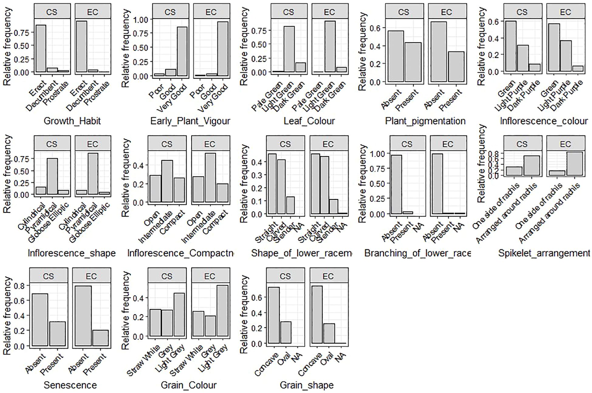 Figure 5. Relative frequency plot showing comparison of variability of qualitative traits in the Entire collection (EC) and core set (CS) of barnyard millet.