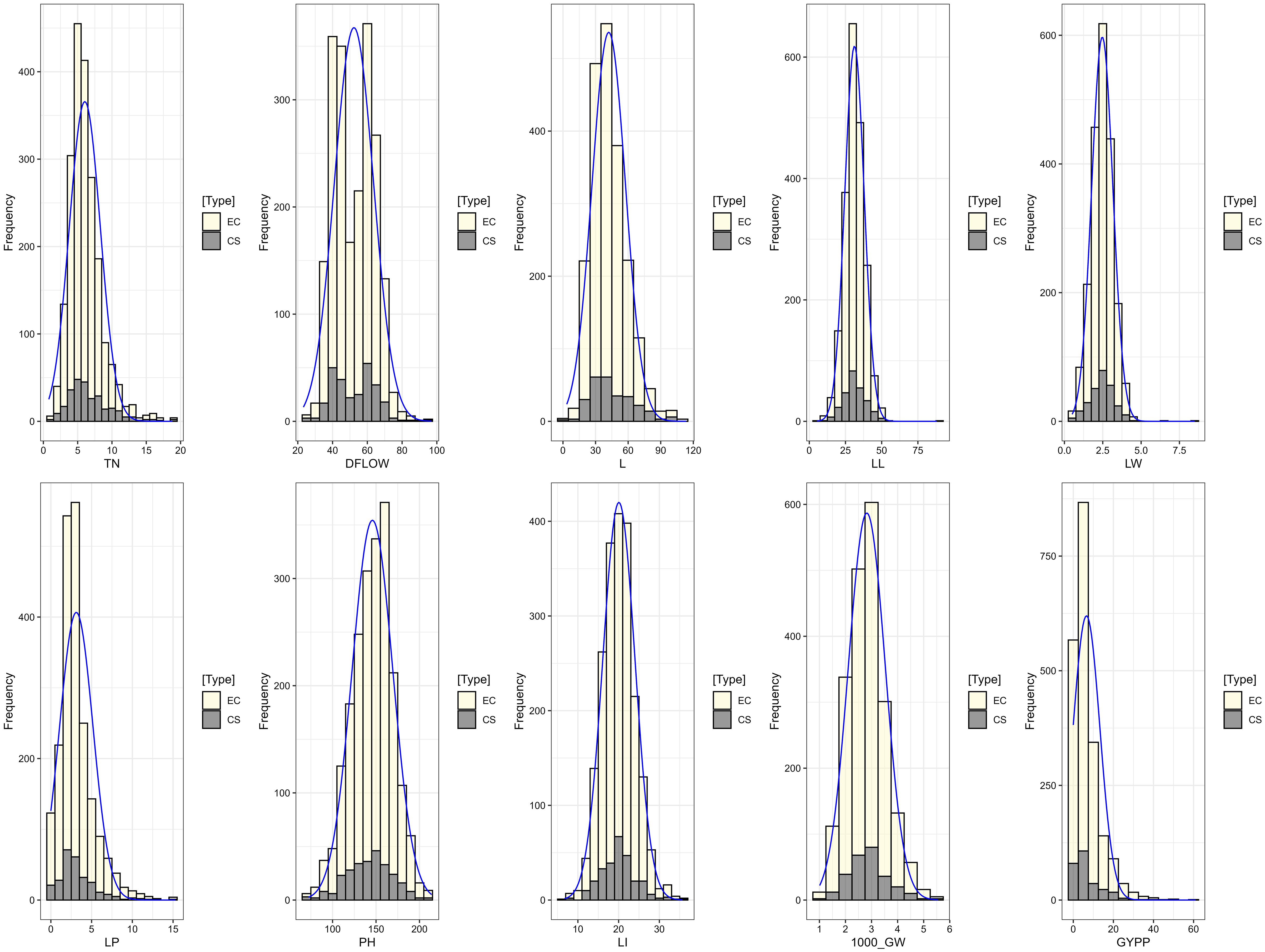 Figure 6. Frequency distribution plot showing comparison of variability of quantitative traits in the entire collection (EC) and core set (CS) of barnyard millet.