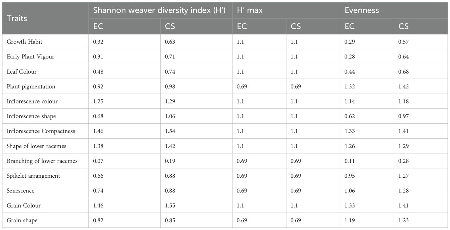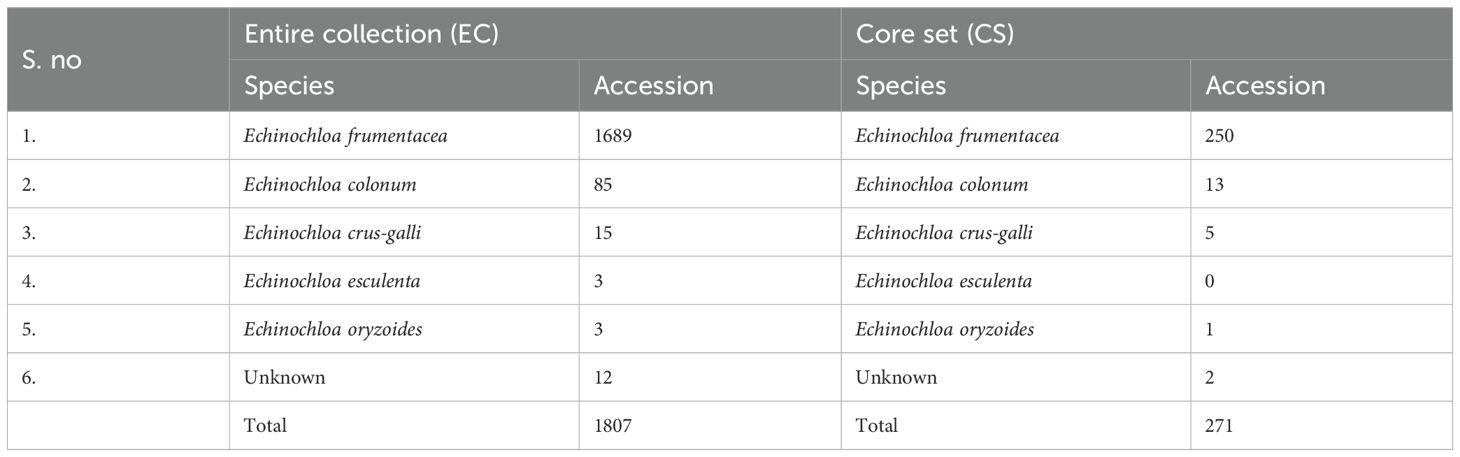 Ex-situ germplasm collections have grown significantly in size and number in recent decades, making it increasingly challenging to evaluate, utilize, and conserve genetic resources. In order to overcome these problems, the idea of core collections was developed in order to maximize genetic diversity within the collection as a whole while improving evaluation and utilization efficiency (Frankel, 1984; Brown, 1989). The two main goals of core collections are (i) to maximize the overall genetic diversity within the core, which is frequently preferred by genebank curators, taxonomists, and geneticists, and (ii) to maximize the representativeness of genetic diversity, which is a top concern for plant breeders (Marita et al., 2000). Furthermore, rather than concentrating only on diversity, users are placing a greater emphasis on maximizing the possibility of finding uncommon alleles or novel accessions that are adaptable to breeding resilient genotype. Rare alleles, often associated with extreme traits, are typically found in secondary and tertiary gene pools (wild and weedy relatives), highlighting the need for classifying accessions into primary and secondary gene pools before core development. This becomes particularly relevant in the context of climate change, as breeders seek to incorporate rare alleles for enhanced biotic and abiotic stress resistance. As our goal was to develop a core set that serves both breeders and taxonomists, we focused on capturing overall diversity as well as extreme trait expressions. Unlike the core set developed by Wallace et al. (2015), which was based on genotyping-by-sequencing (GBS) of a global subset and emphasized neutral genetic diversity, our approach relied on phenotypic evaluation of the entire Indian NGB collection. While Wallace et al. (2015) successfully established SNP-based species level resolution and population structure, their core set was limited in capturing Shannon`s H`. In contrast, our core set maintained broad coverage for key traits like plant height and 1000 seed weight and achieved high Shannon-Weaver diversity indices across qualitative traits. Moreover, our set retained rare morphotypes, including wild E. frumentacea accessions, which are often absent from global collections, highlighting its value in representing localized,adaptive variation. While molecular markers are useful for assessing genetic variation, they may not always reflect traits of agronomic or adaptive importance. In underutilized crops like barnyard millet—where genome-wide marker data are limited and costly to generate for large collections—phenotypic data provide a practical and directly relevant basis for core set development. This approach is especially valuable for breeding programs, as it reflects real-world trait performance under field conditions.