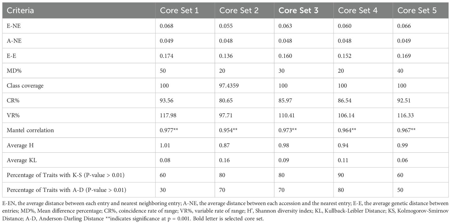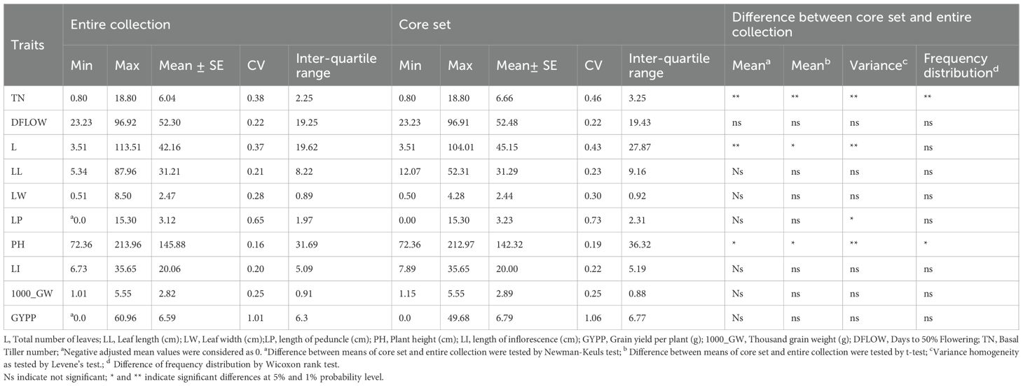Core 3 preserved distribution patterns and extremes, as reflected in Kolmogorov–Smirnov and Anderson–Darling tests, which showed that 80% and 70% of traits, respectively, followed the original collection’s distribution at a 1% significance level. Although Core 2 and Core 4 had slightly lower MD%, their performance in CR% and VR% was weaker. Core 1 and Core 5, while diverse, showed higher MD% and less favourable KL distances. Core 3 also had higher coefficients of variation (CV) than the entire collection for most traits, in line with Franco et al. (2006) and Thachuk et al. (2009), indicating greater phenotypic variability. Interquartile ranges were largely consistent with the entire collection, except for leaf length and basal tiller number. Quantile-Quantile (QQ) plots (Supplementary Figure 2) and Kullback-Leibler (KL) distances (0.06–0.11) confirmed strong similarity between trait distributions in Core 3 and the full set (Wilk and Gnanadesikan, 1968; Kullback and Leibler, 1951).