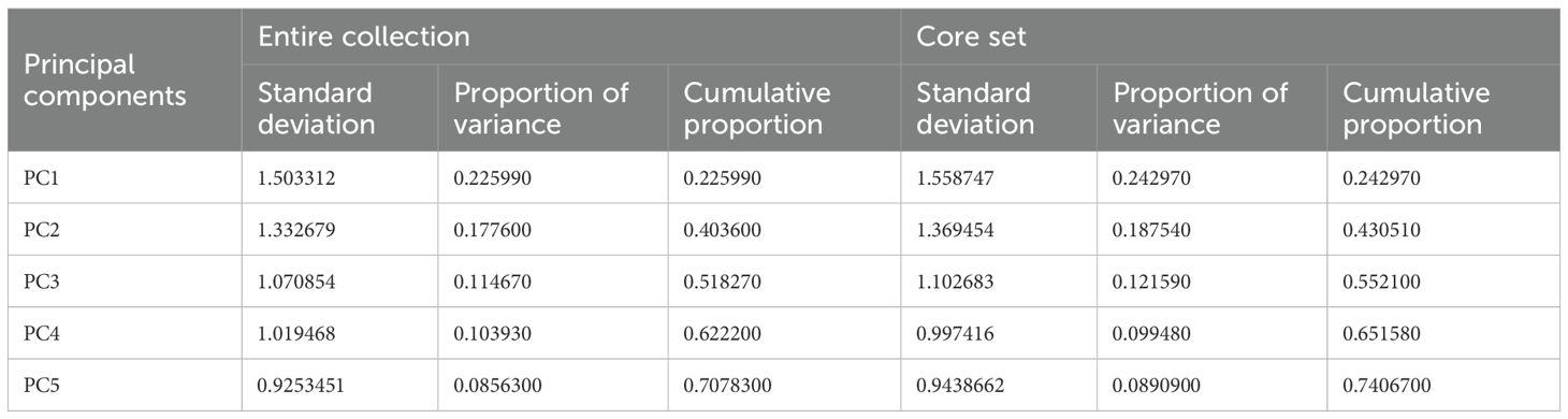 Methods: Thirteen qualitative and ten quantitative traits were evaluated. Five core sets were created using Core Hunter 3, utilizing optimization approaches to enhance representativeness and diversity. Comparisons were made between the entire collection and the developed core sets using diversity indices, statistical parameters, correlation analysis, and principal component analysis (PCA).