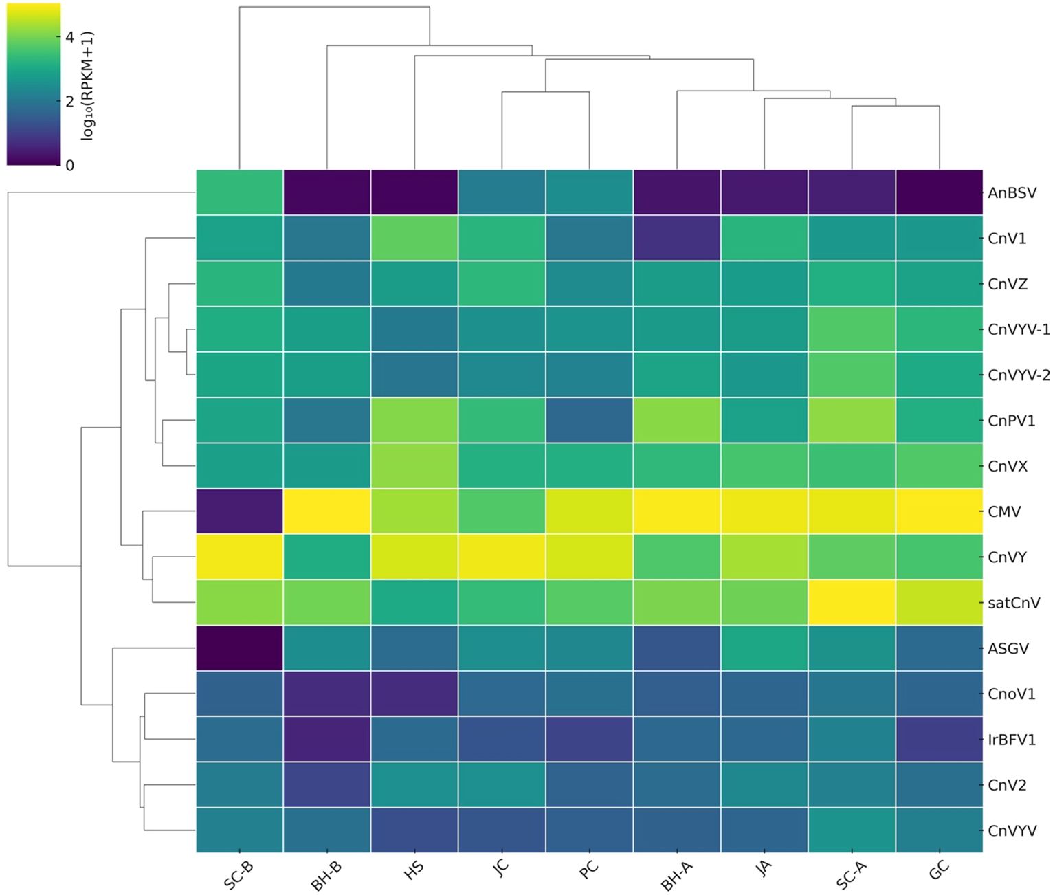 Figure 2. Heatmap illustrating the abundance of major viruses detected in Cnidium officinale samples from nine distinct cultivation regions in Korea. Data represent normalized abundance values calculated as log10(RPKM + 1). Hierarchical clustering was performed using average linkage with Bray–Curtis distance. Viruses (rows) are represented by abbreviations; regions (columns) indicate sampling sites.