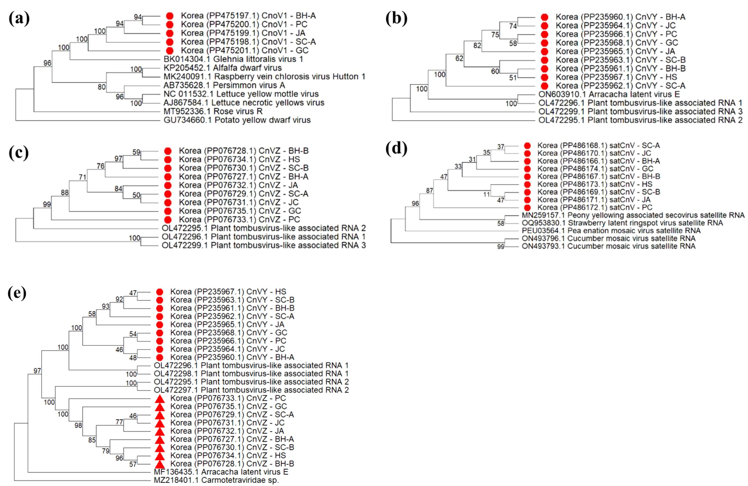 Figure 4. Maximum‐likelihood phylogenetic trees of novel viruses detected in Cnidium officinale. (a) Tree for five cnidium cytorhabdovirus 1 (CnoV1) isolates (BH-A, SC-A, PC, JA, GC) alongside reference Rhabdoviridae genomes. (b) Tree for nine cnidium vein‐yellowing virus isolates (CnVY and CnVZ; sites BH-A, BH-B, SC-A, SC-B, JC, JA, PC, HS, GC) with Tombusviridae genus references. (c) Tree showing satellite RNA (satCnV) sequences along with known Secoviridae satellite RNAs. All trees were inferred using MEGA11 with the neighbor‐joining method and 1,000 bootstrap replicates; bootstrap support ≥ 70% is indicated at the nodes, and branch lengths represent nucleotide substitutions per site. Korean isolates from this study are highlighted in red.