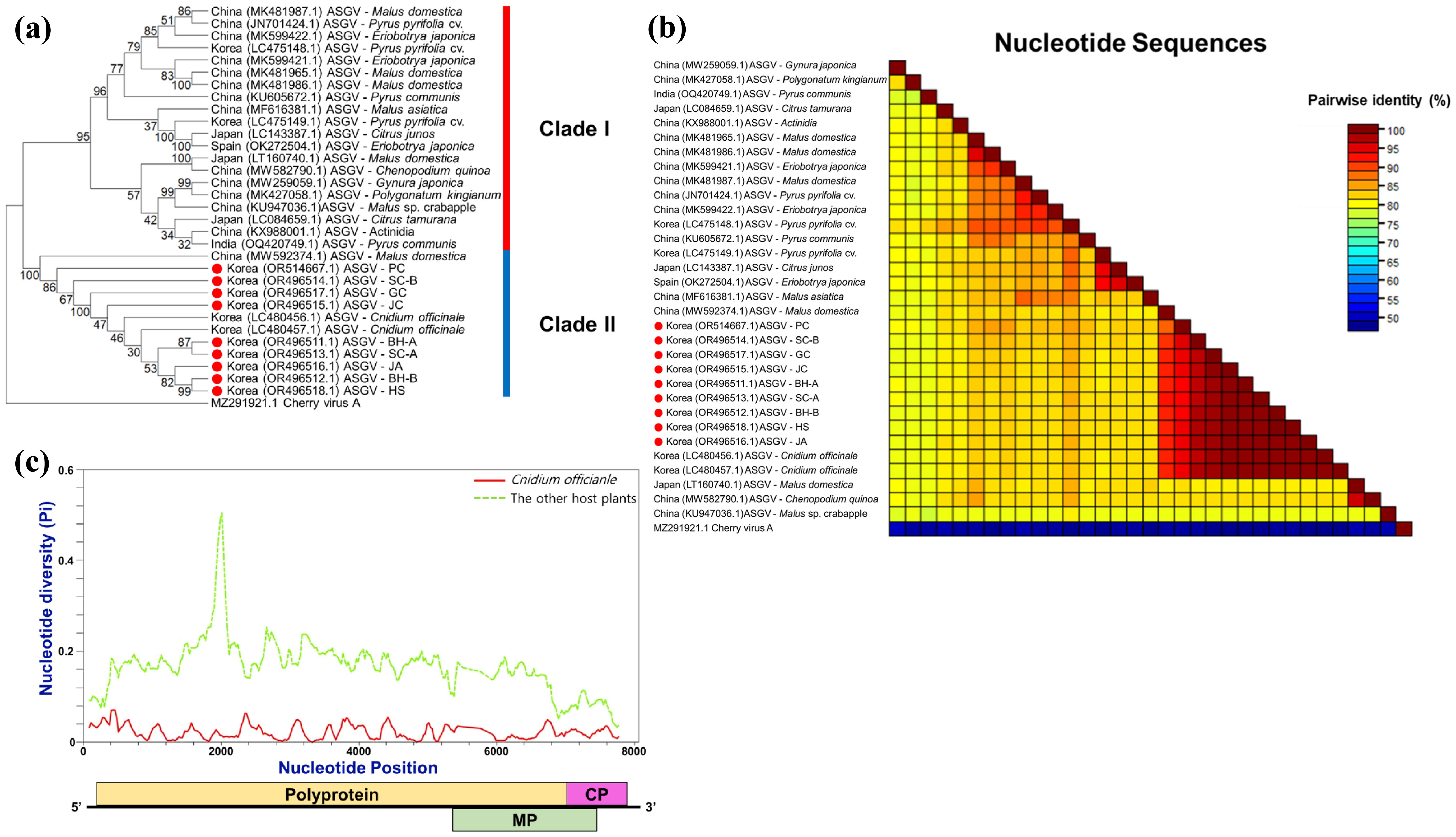 Figure 5. Phylogenetic relationships and nucleotide‐diversity profiles of ASGV isolates in Cnidium officinale. (a) Neighbor‐joining phylogenetic tree of complete ASGV genomes (isolates from this study plus reference sequences), inferred in MEGA11 with 1–000 bootstrap replicates; bootstrap values ≥ 70% are shown. (b) Pairwise percent‐identity matrix of ASGV coat‐protein sequences computed by SDT v1.3 (red = low identity/higher divergence; blue = high identity/lower divergence); reference strain names appear along axes. (c) Sliding‐window nucleotide diversity (π) across ASGV genomes (window = 200 nt, step = 50 nt) calculated in DnaSP v6; the x‐axis indicates genome position and the y‐axis shows π values for each alignment window.
